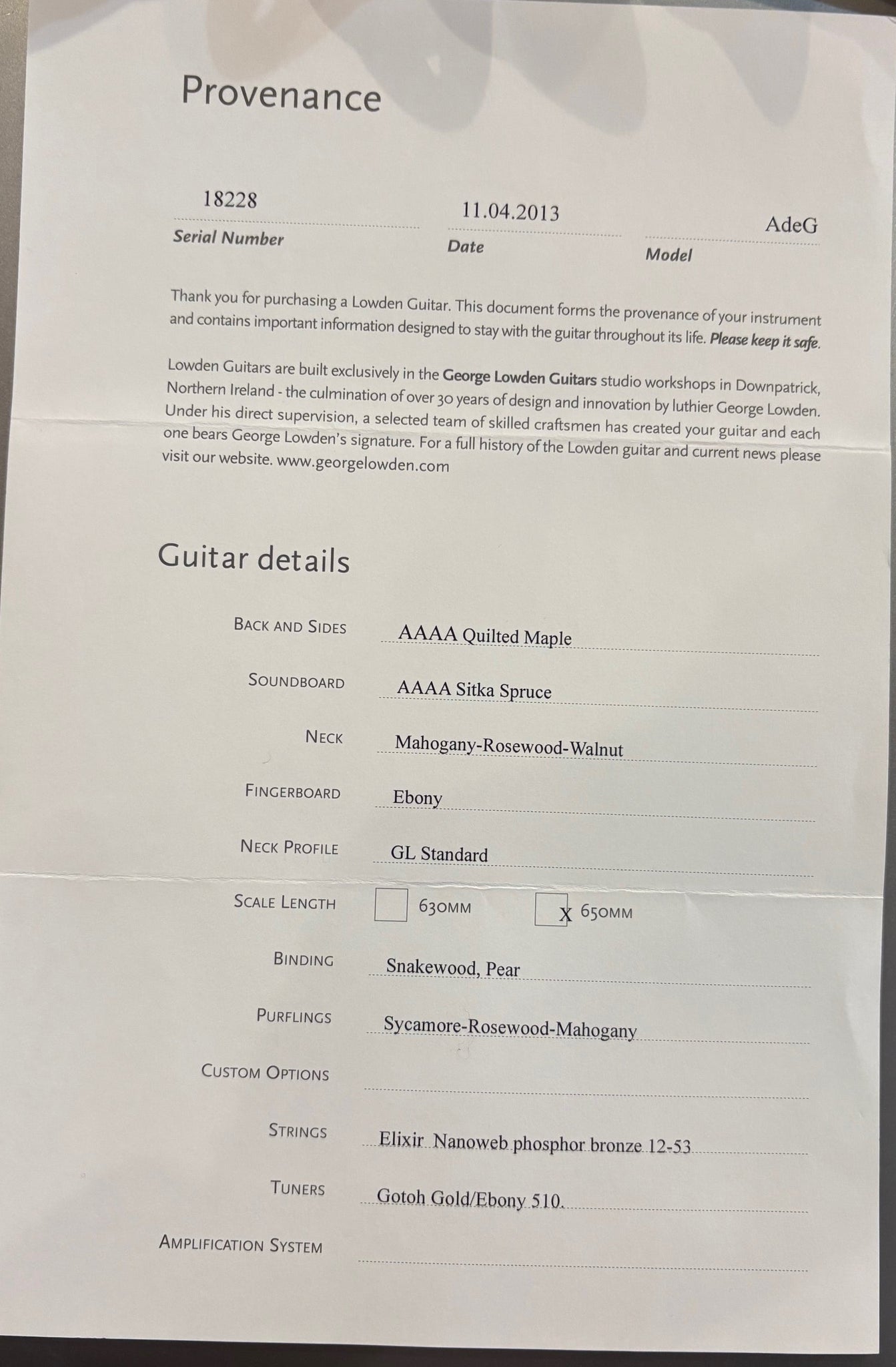 Up for sale is a 2013 Lowden Alex De Grassi Signature F-50c. This example has an LR Baggs pickup installed, I am unsure if this is factory or not. Condition wise this example is in excellent condition less some faint signs of play wear and few dings on the face of the body but otherwise is fairly clean.