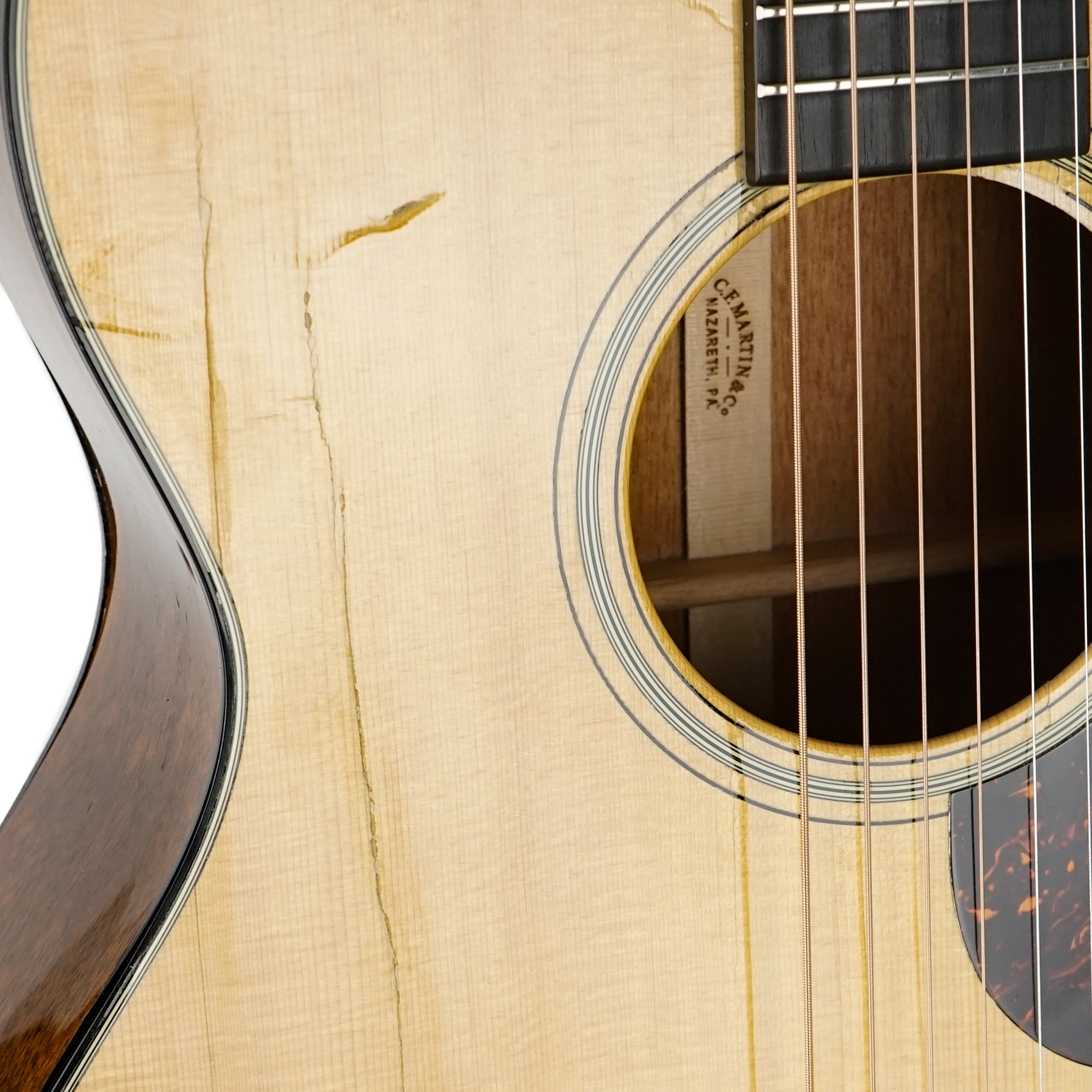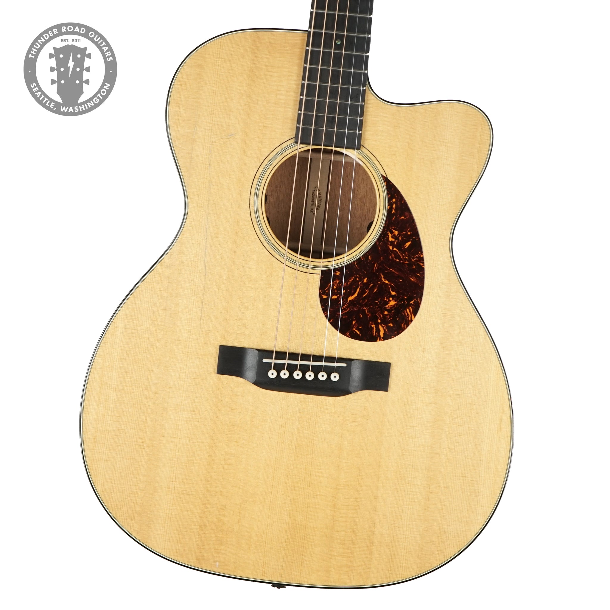 Up for sale in the shop is a 2016 Martin OMC-18E. The one has had a bit of battle damage but has been brought back to life with some stellar professional repairs. Cosmetically this one is a little rough but it plays and sounds really great. The repairs include a recent neck reset, a 6 inch crack on the top near the bass side that has been professionally cleated, and a small bit of wood missing from around the sound hole near the treble side. Other than that there are obvious signs of play wear such as small scratches and scattered dings. This guitar is a total value! This guitar does not come with a case however it does come to you professionally setup by our in house tech. Weight: 4lbs. 0oz.