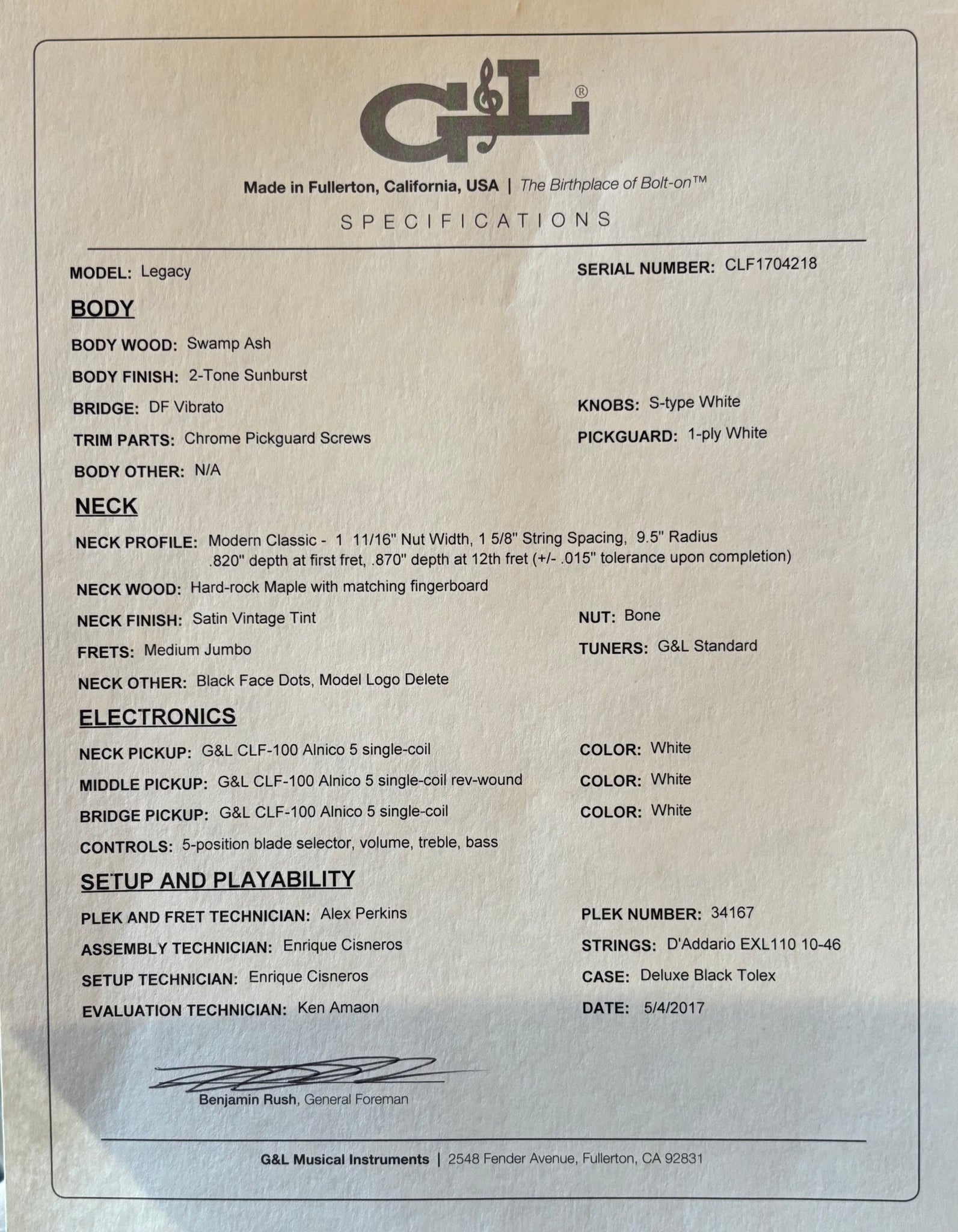 Up for sale is a clean 2017 G&L USA Legacy USA in Two Tone Sunburst. This example is in amazing condition showing little signs of play wear or use. Pro setup in house and comes complete with its original hard case and paperwork. Weight: 8lbs. 1oz.