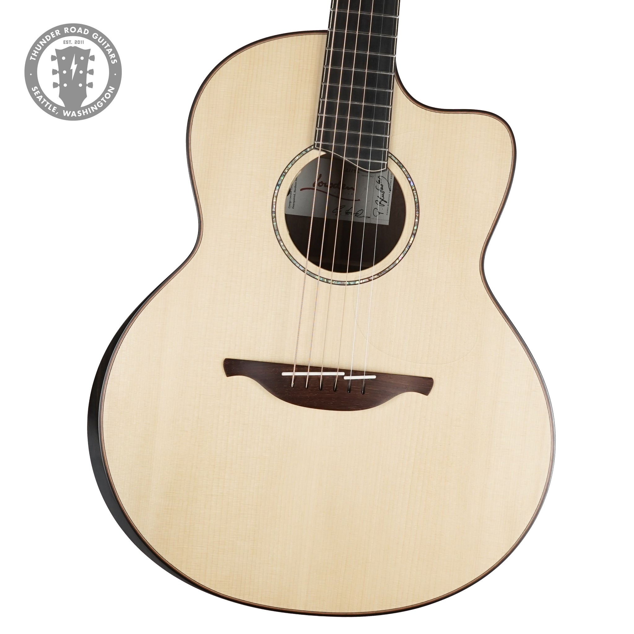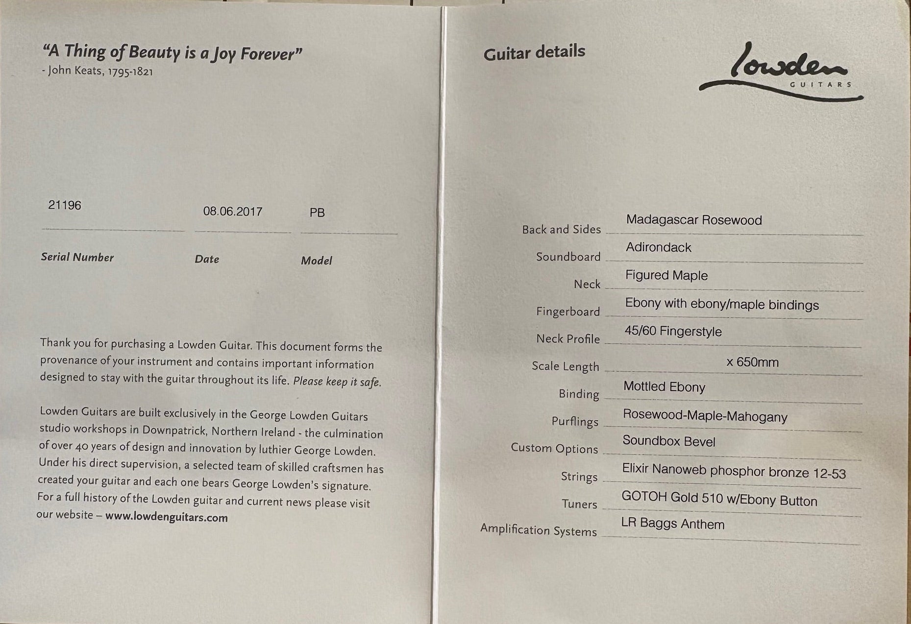 Up for sale is a clean 2017 Lowden Pierre Bensusan F-50c in natural. This example is in excellent condition less some very faint play wear. There is also a small spot where the grain fill appears to lift above the finish just a tad and can be felt. This is contained to the side of the body on the bass side near the contour before the neck joint. Otherwise this example is in excellent condition.