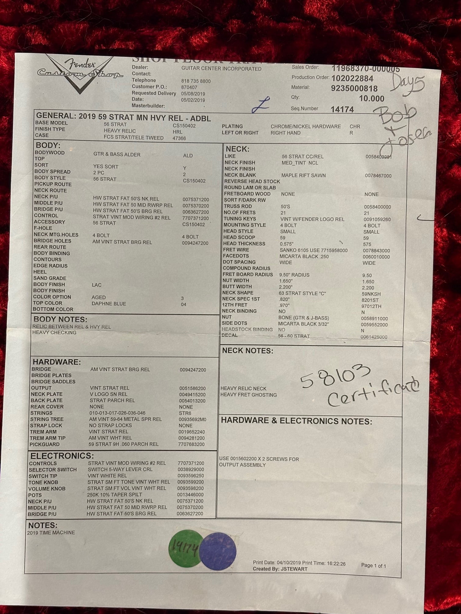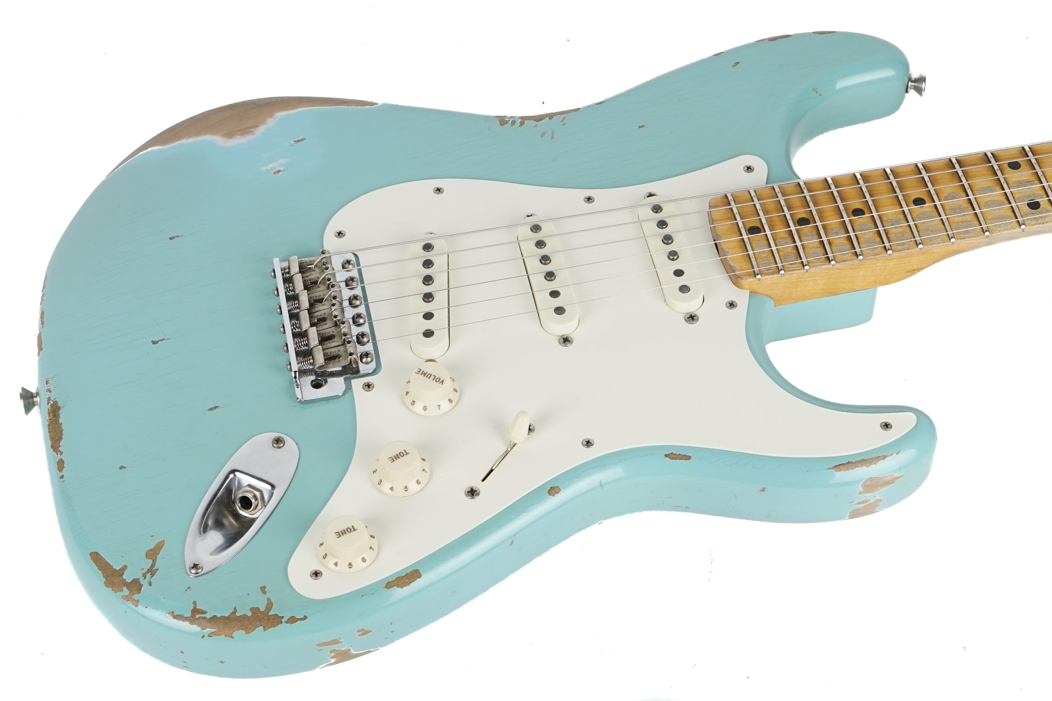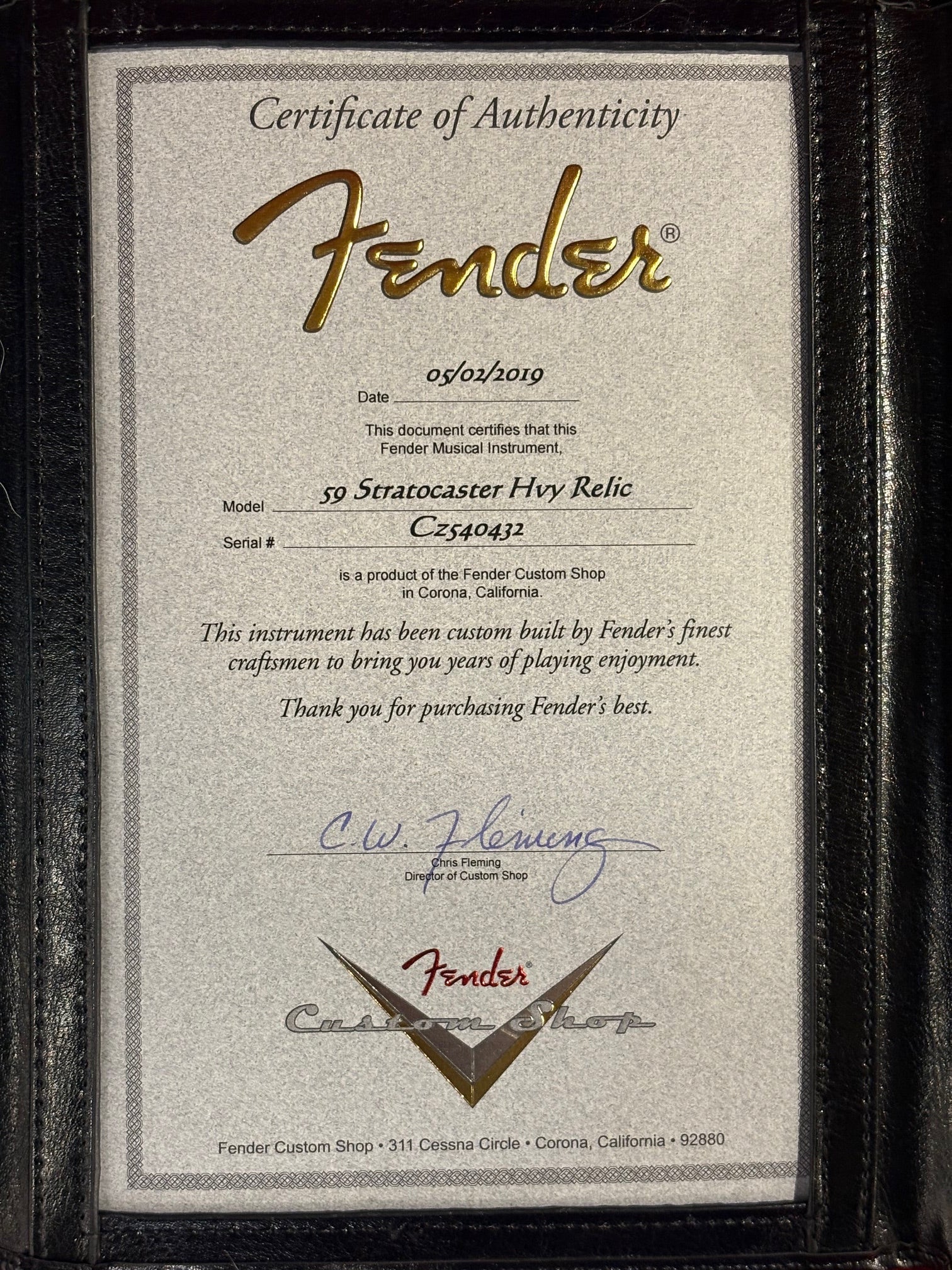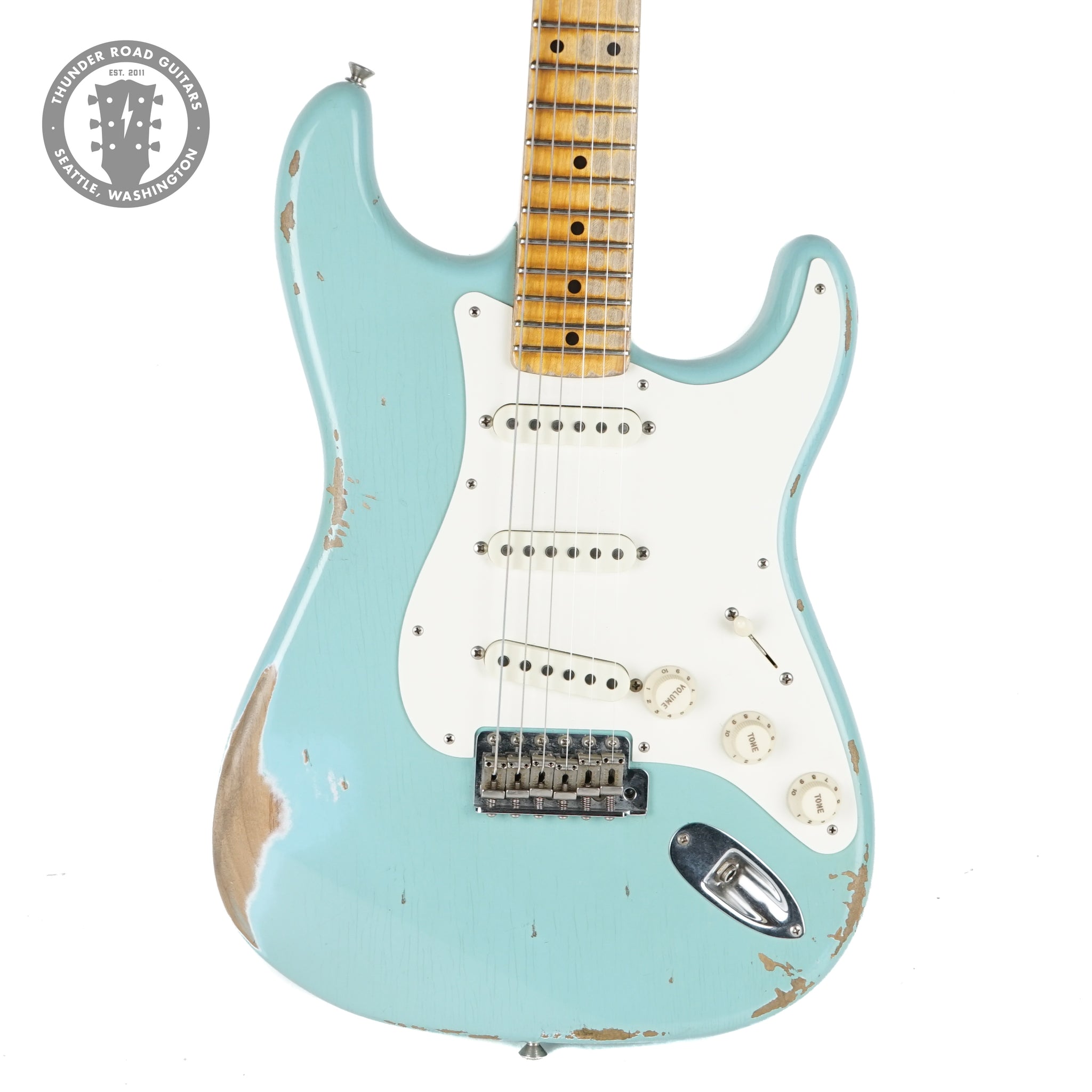 Up for sale in the shop is a killer 2019 Fender Custom Shop '59 Stratocaster in Daphne Blue finish with a heavy relic aging. This instrument is a total stunner and needs a loving home. Cosmetically this one is really nice and the frets show almost no signs of wear. For specs on this guitar please refer to the build traveler in our photos.