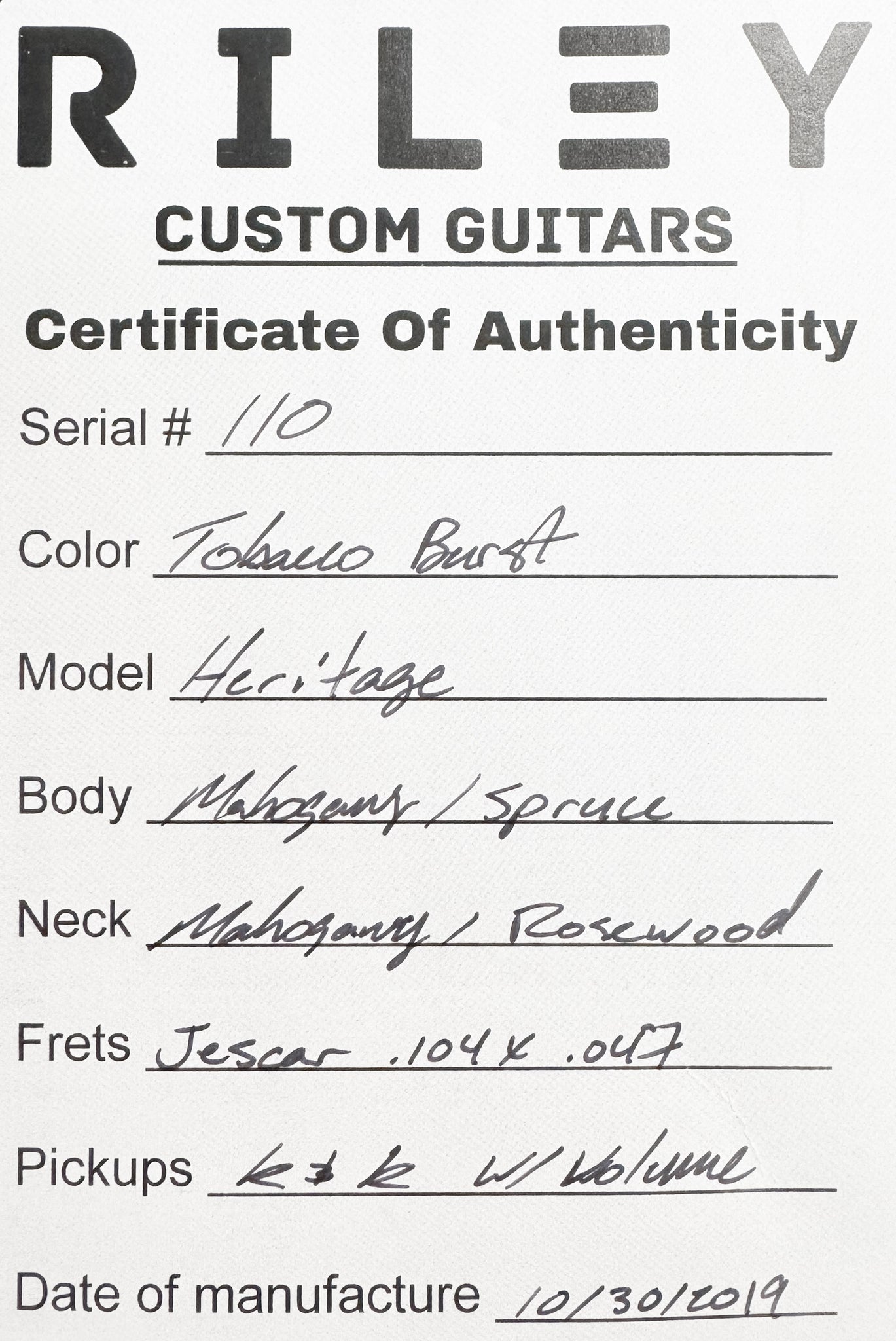 Up for sale is a 2019 Riley Heritage Acoustic-Electric in Tobacco Burst. Weight: 5lbs. 1oz.