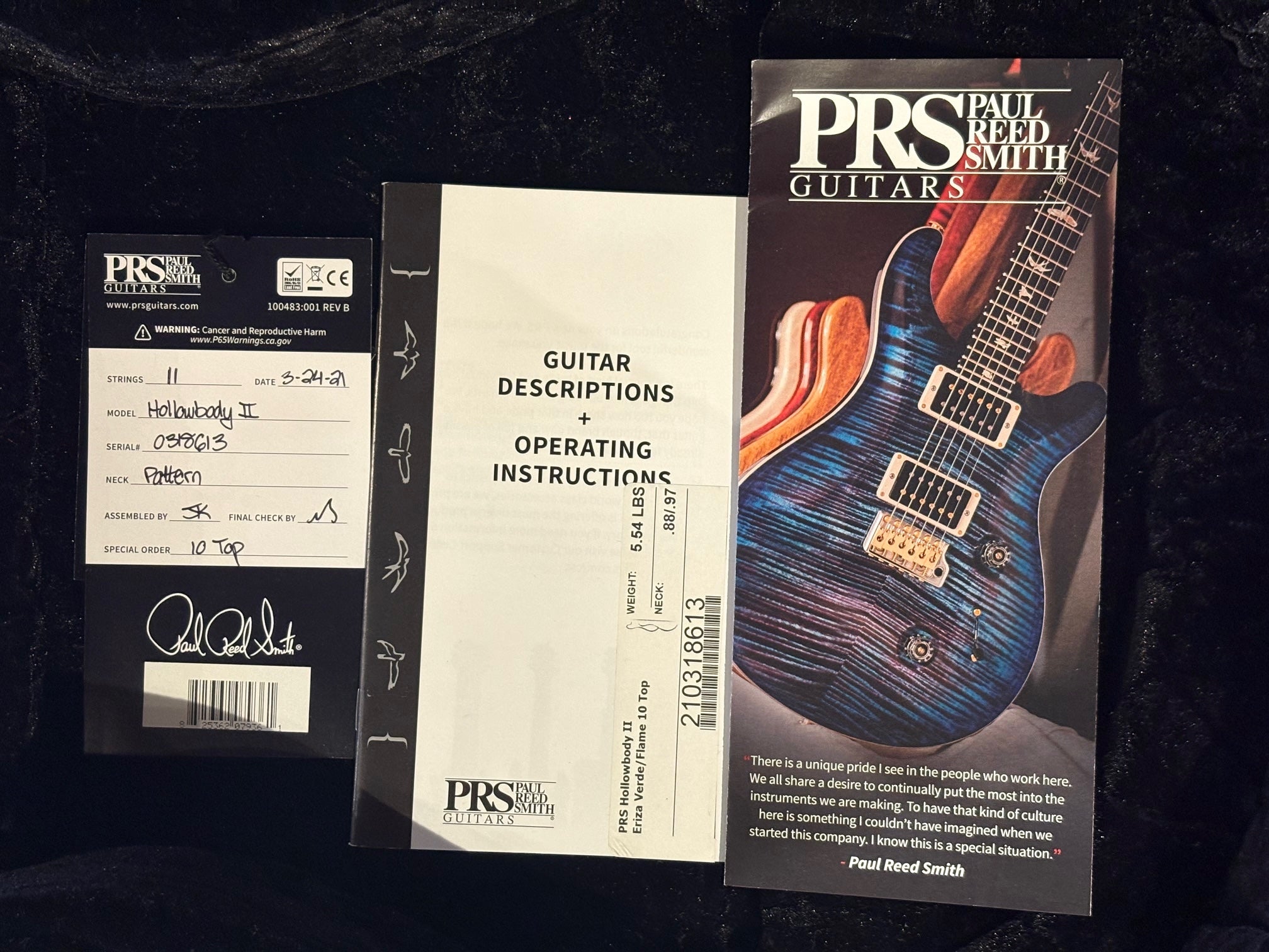 Up for sale is a 2021 PRS Hollowbody II 10 Top in Eriza Verde. This example features a pattern neck profile, stunning 10 top and is just a beautiful example of what the builders at PRS are capable of. Overall this one is exceptionally clean showing little signs of play wear or finish wear. Pro setup in house and comes complete with its original hard case and paperwork. Weight: 5lbs. 10oz.