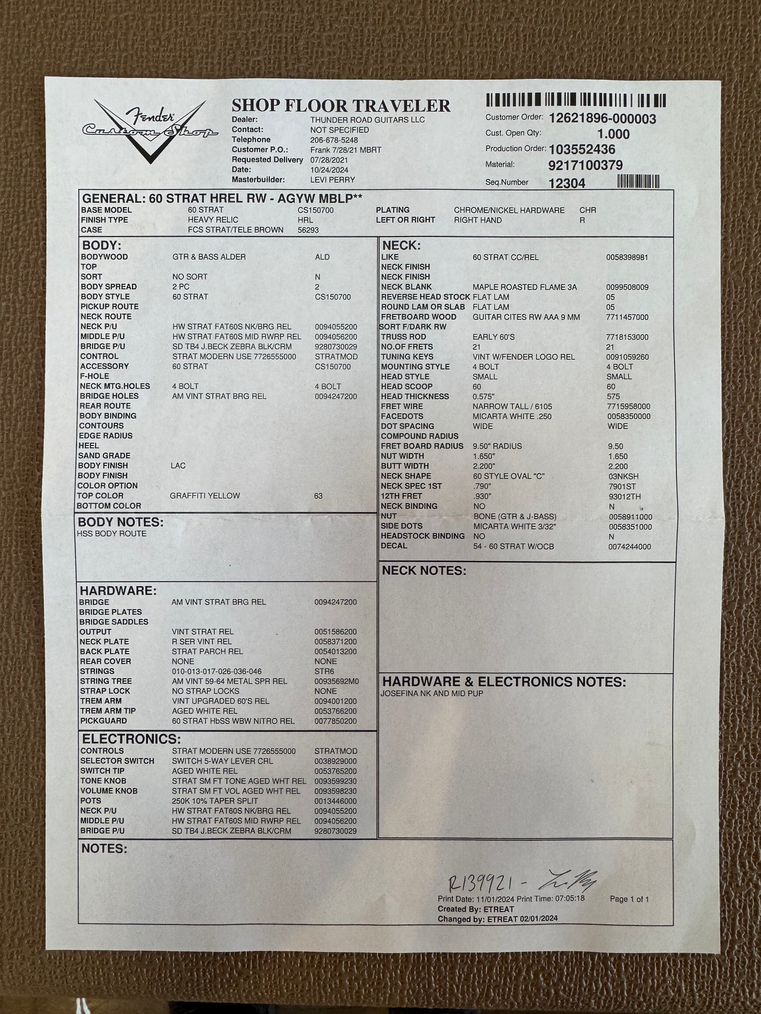 Up for sale is an absolutely stunning lightly used 2024 Fender Custom Shop '60 Heavy Relic Stratocaster Masterbuilt by esteemed Fender builder Levi Perry. For a full list of specs please see the build sheet photo in our ad.