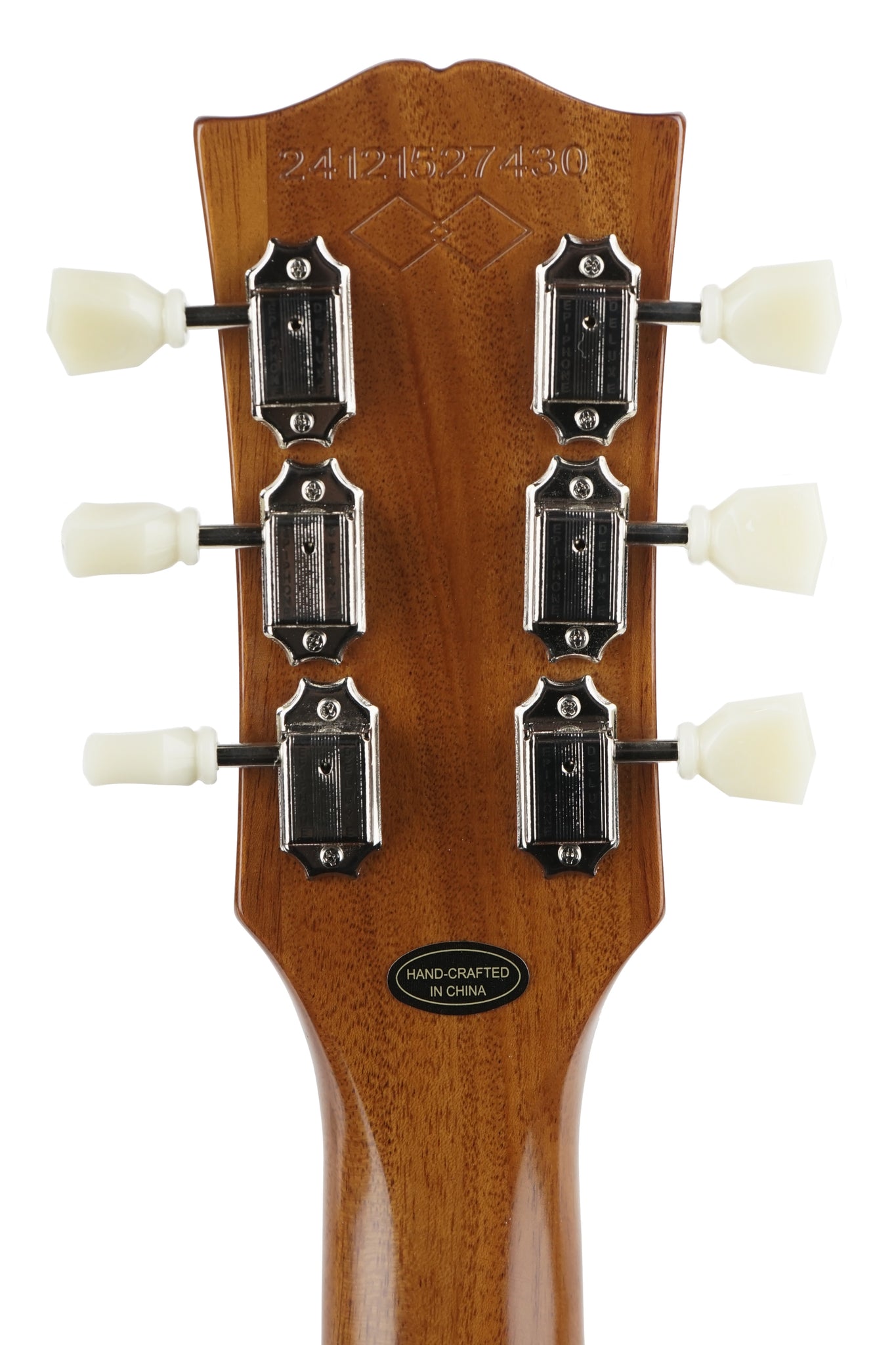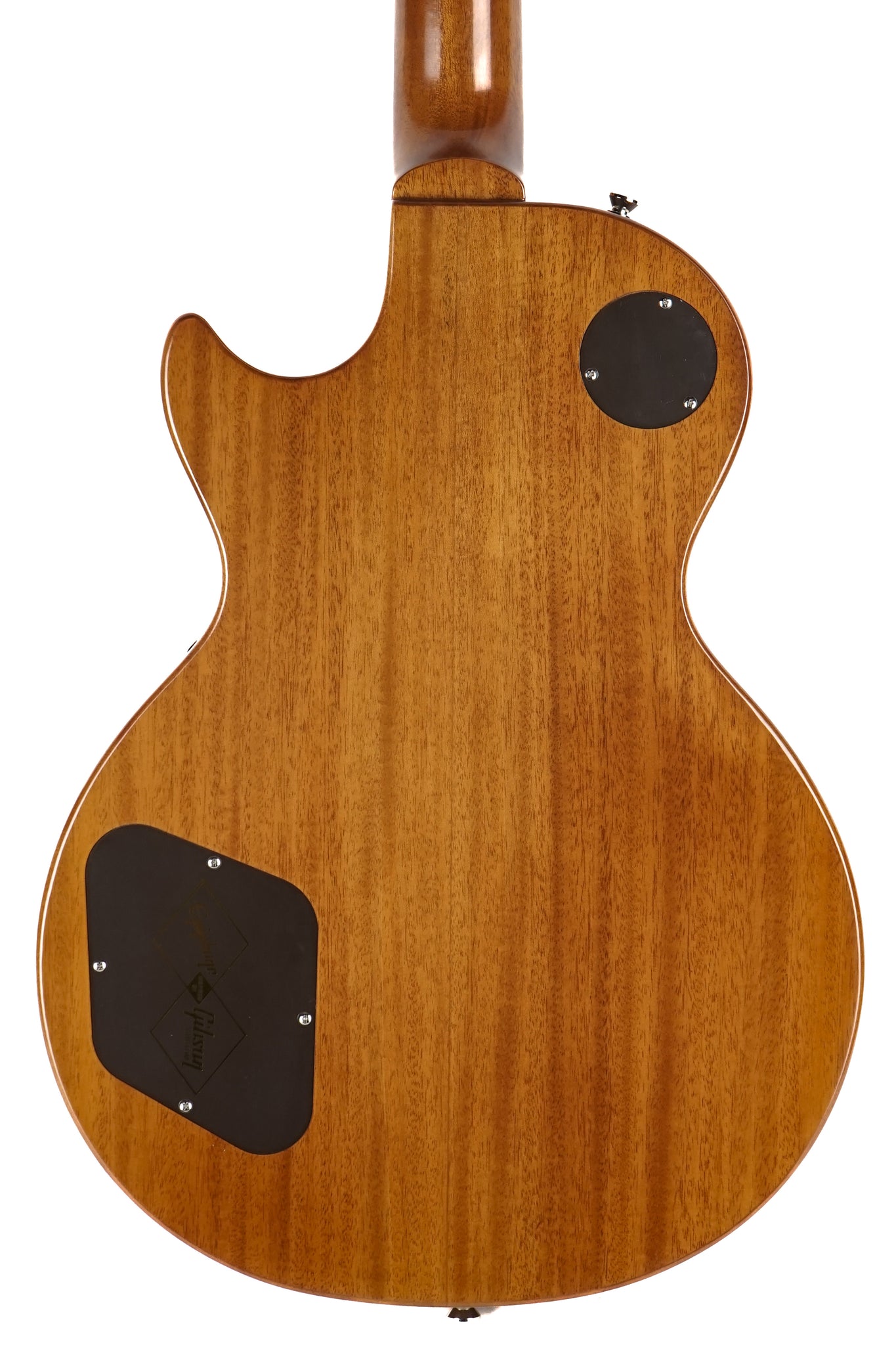 Mahogany body, maple top, one piece mahogany neck with rosewood fretboard and 50s Rounded Medium C profile, Custombucker pickups, CTS pots and Bumblebee paper-in-oil caps, Gibson open book headstock, Inspired by Gibson Custom hardshell case