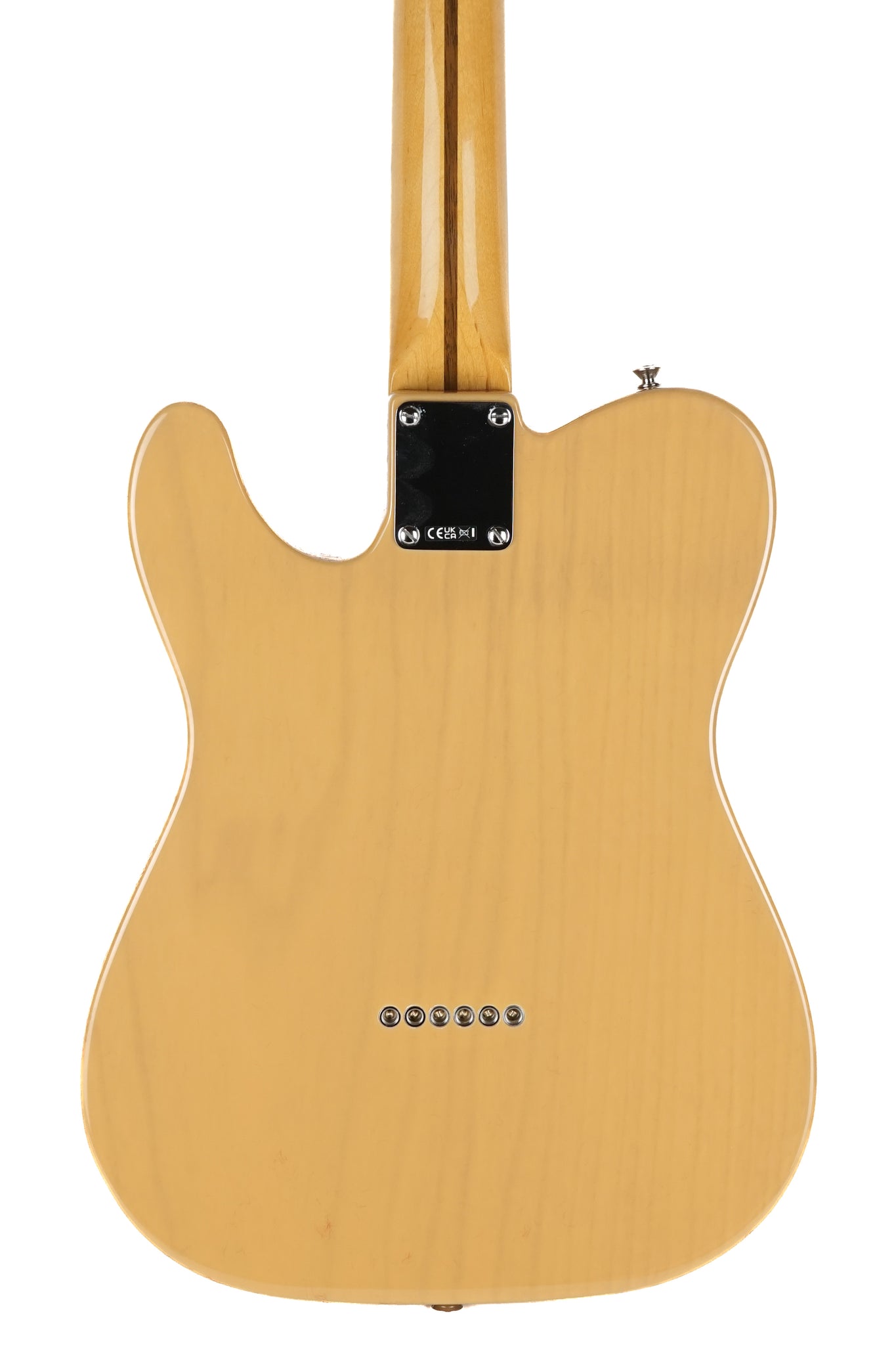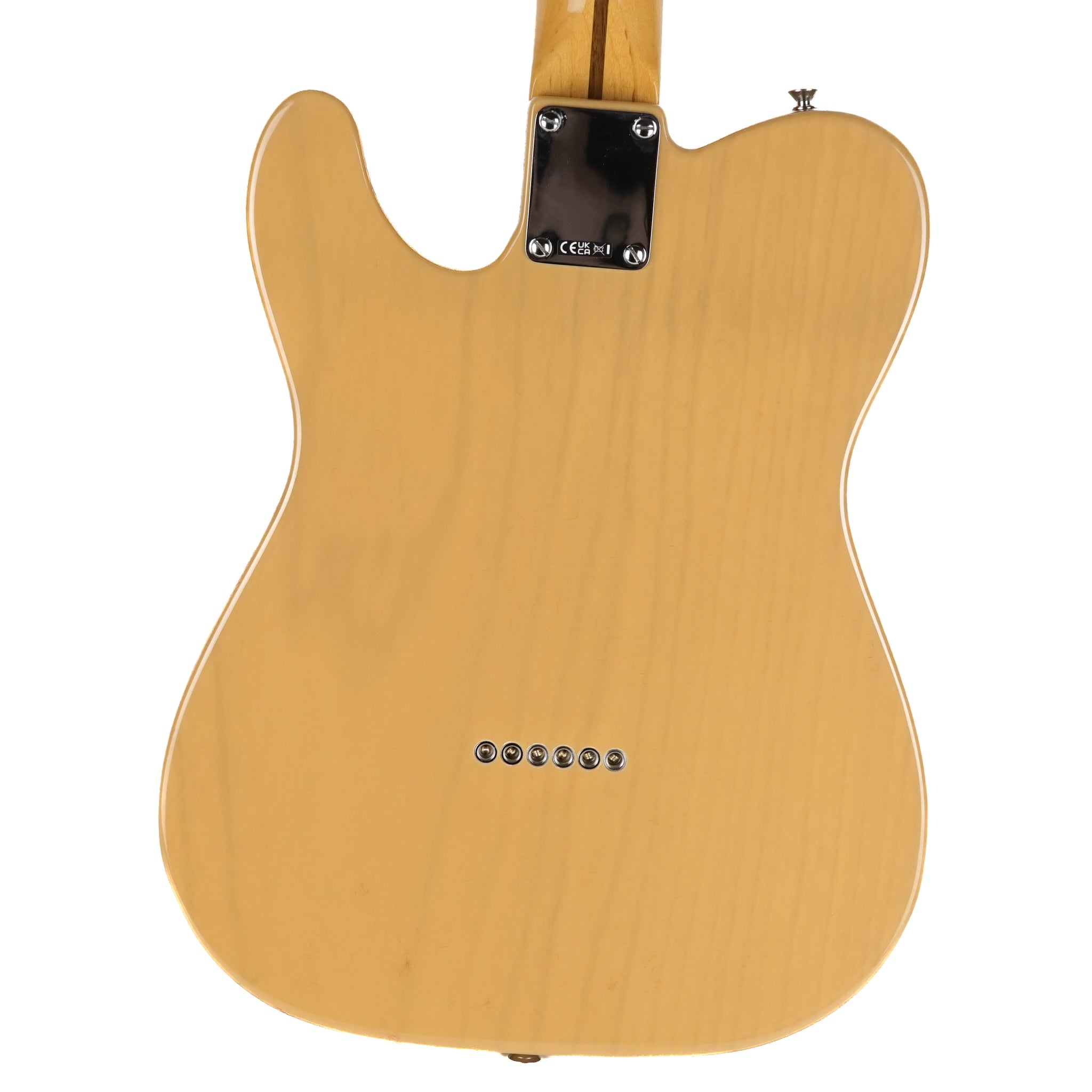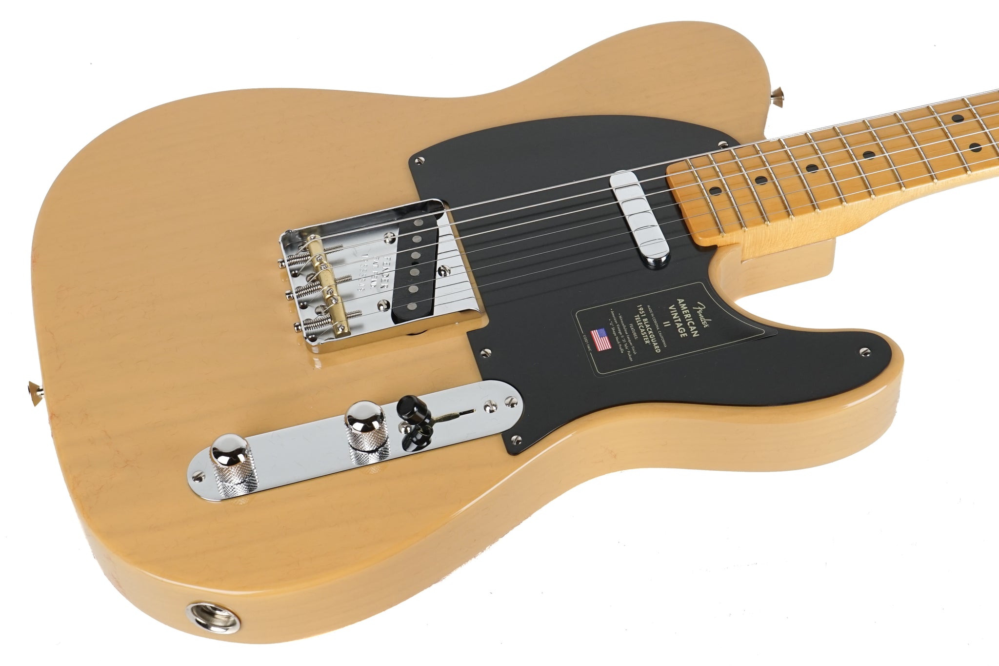 The American Vintage II 1951 Telecaster features an ash body finished in Butterscotch Blonde to capture the tone and look of the original. The substantial '51 "U"-shaped hard rock maple neck plays like a dream with a 7.25" radius fingerboard and vintage tall frets. Characteristic of production in 1951, 12th fret face-dot spacing is narrow and the sole Phillips-head fastener on the guitar is at the truss rod nut. The triple brass saddle bridge, single-line "Fender Deluxe" tuners and Pure Vintage '51 Telecaster pickups deliver classic twang and authentic Fender style.