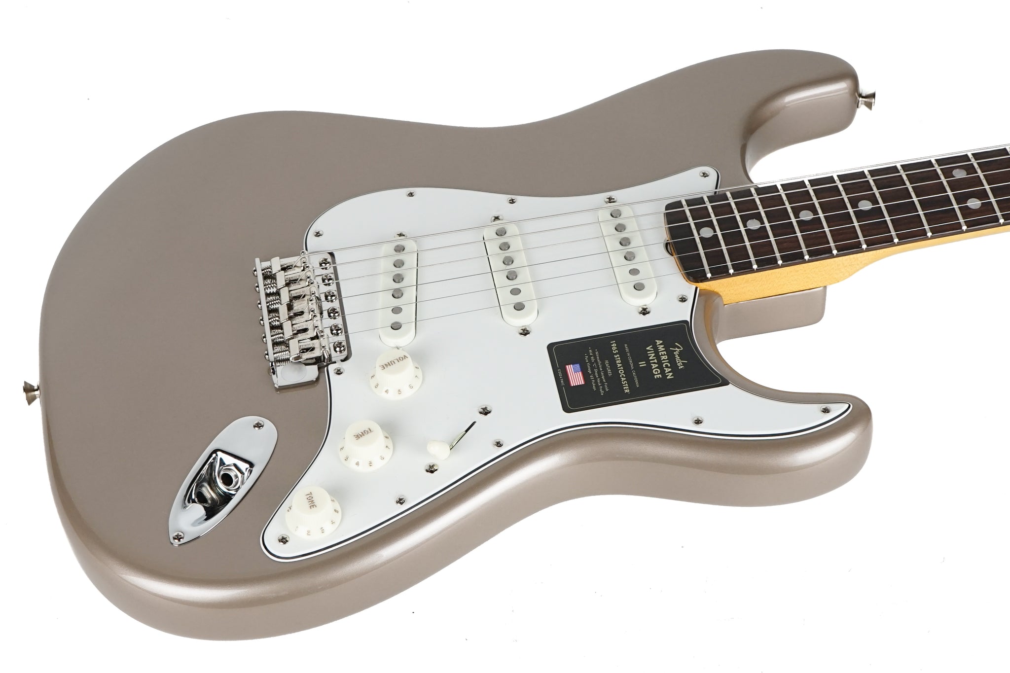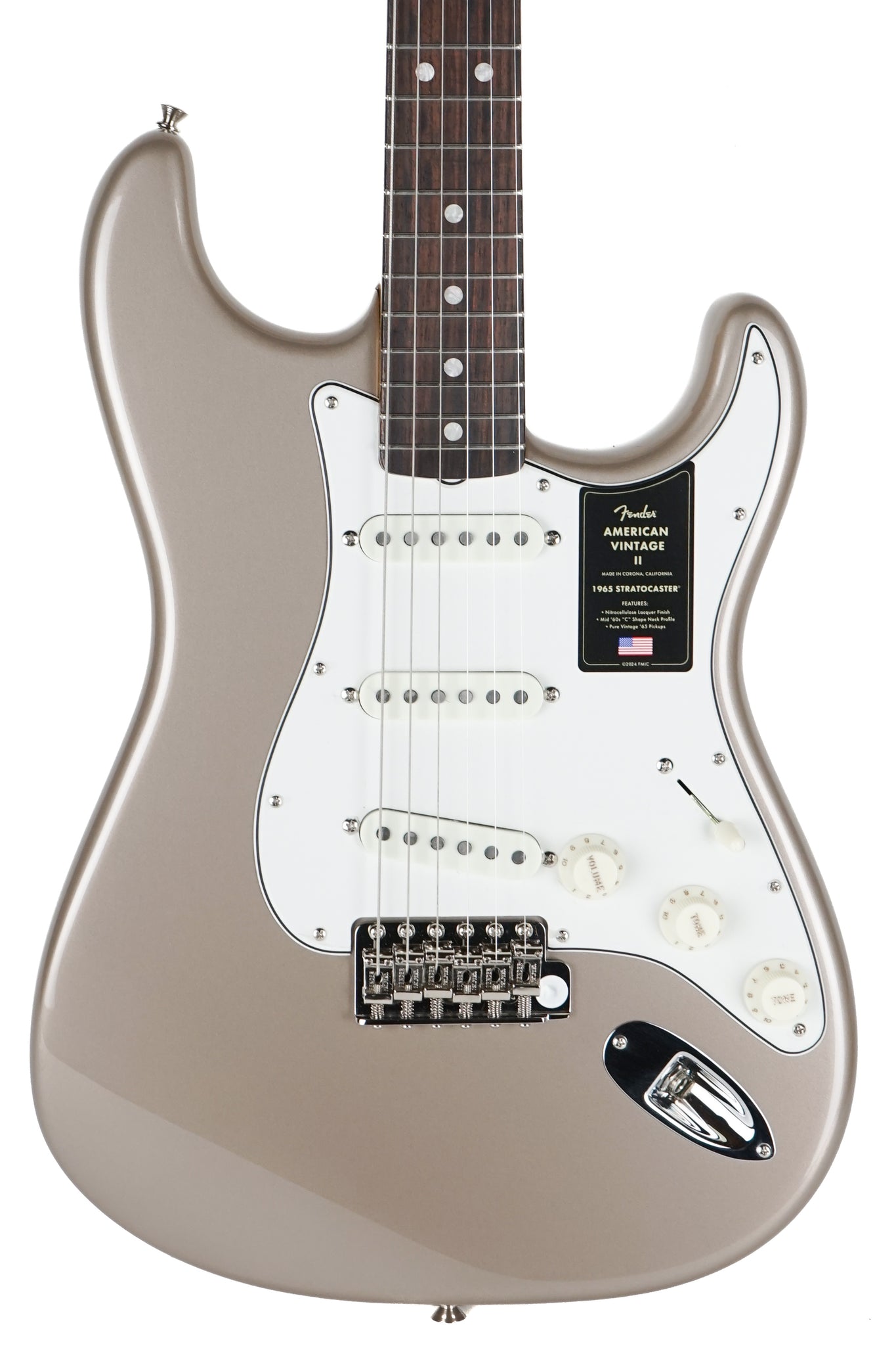 Relive the sound and spirit of 1965 with the American Vintage II 1965 Stratocaster. Smack in the middle of one of music’s most electrifying decades, the Stratocaster in 1965 was an instrument on its way to becoming rock’s greatest electric guitar. A perfect example of a Strat in a transition year, the 1965 Stratocaster® features a 1965 “C”-shaped maple neck, this time with a round-laminated rosewood fingerboard and larger pearl dot inlays. Other authentic features include an 11-hole three-ply white pickguard, the incredibly cool transition logo with larger lettering, and a set of amazing “gray bottom” Pure Vintage 1965 pickups.