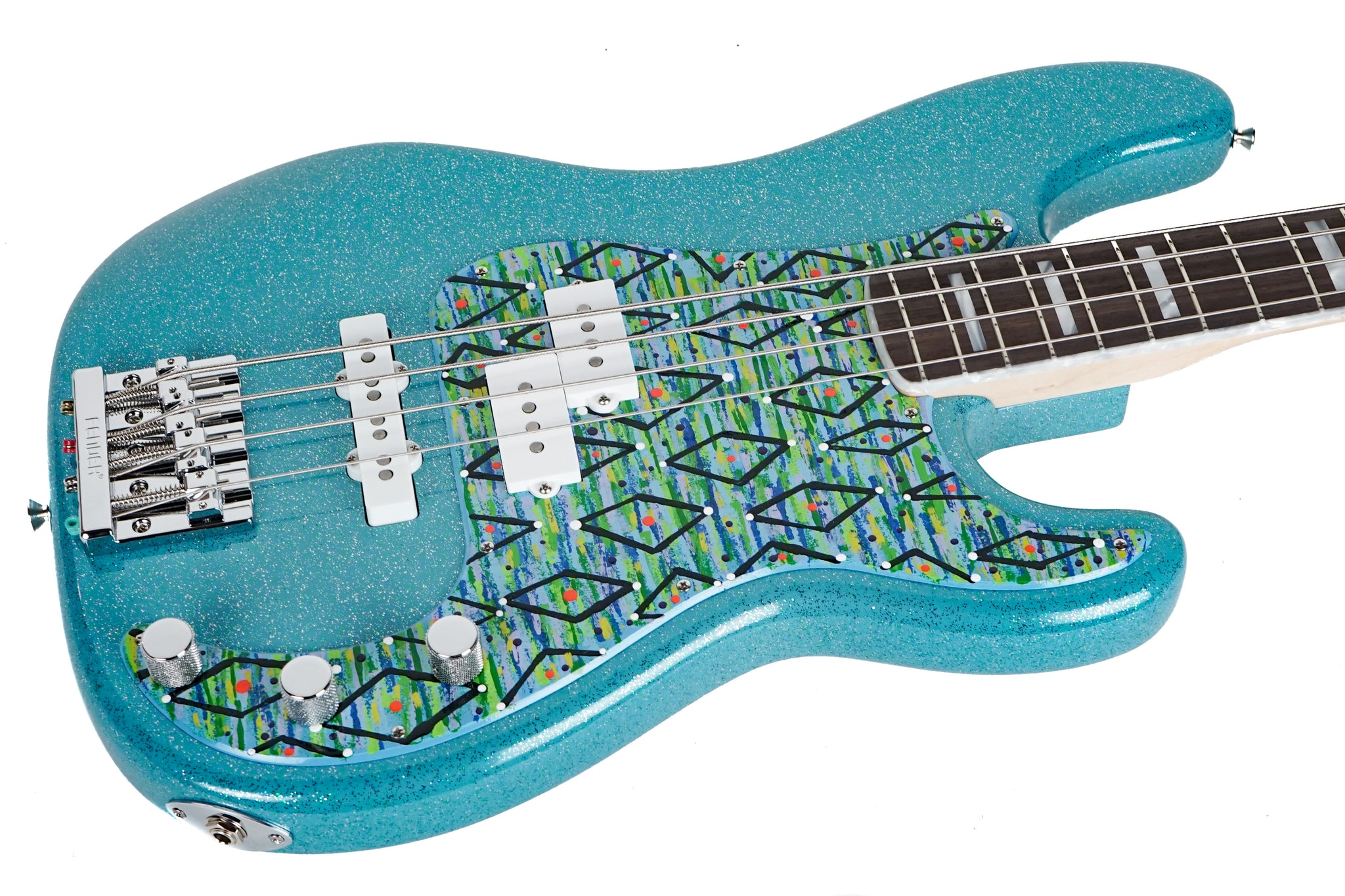 Up for sale is a Stunning 2024 Fender Custom Shop Masterbuilt Jason Smith P/J Bass NOS in Taos Turquoise Sparkle. This bass is truly a sight to behold and features a hand painted pick guard by the artist Laura Bennett. We are an authorized Fender Custom Shop Showcase Dealer and have one of the largest selections of Custom Shop Fenders in the Pacific Northwest. For a full list of specs please see the build sheet photo in our pics.