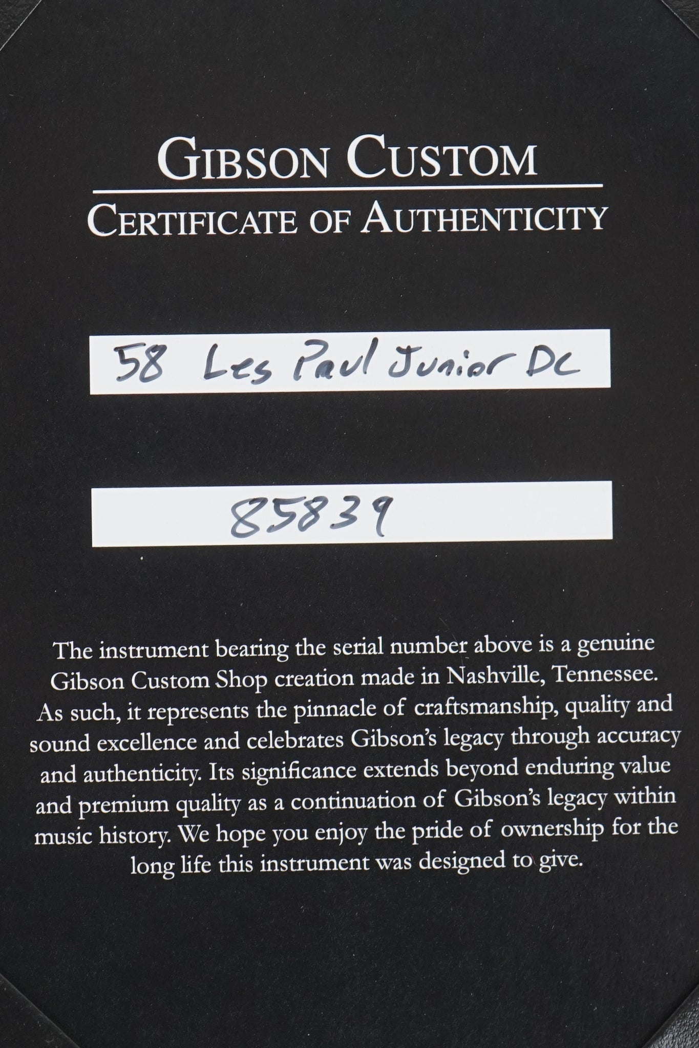 1958 was a monumental year for Gibson in which a whole new lineup of now-famous models were introduced. One of them was the redesigned "double cutaway" Les Paul Junior, which has since found its place in music history as a favorite of hard rock musicians. The extra fret access of the double-cut construction allows upper octave leads, while the "simple is better" single-pickup setup projects only thick, heavy tone. Gibson Custom Shop has proudly revived the original recipe from 1958 for this Historic Reissue, from the solid mahogany and hide glue construction to the vintage-style wiring. It is an accurate and faithful replica in every possible way.