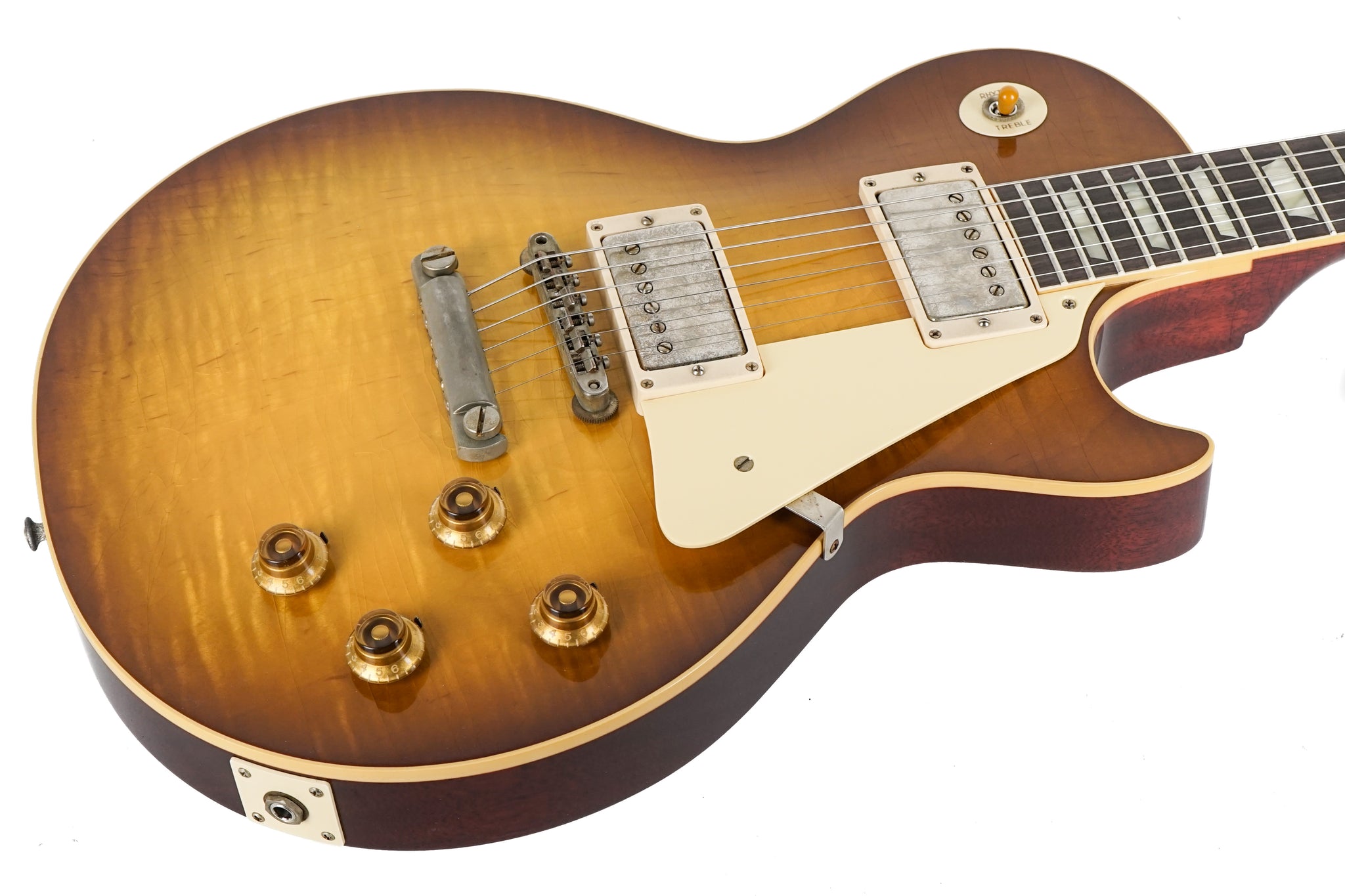 In collaboration with our friends at the Gibson Custom Shop We are thrilled to present the New Gibson 1959 Les Paul Standard Reissue "The Ultimate" in Golden Poppy Burst. The latest entry to the TRG Stringer series pays tribute to the instruments made at the now defunct Norther Prairie Music in the mid to late 70's which are near and dear to our hearts. This '59 features a hand picked top, a Zebra unpotted custom bucker in the neck and a double classic white unpotted custom bucker in the bridge. Both pickups are included in the case. This one also features an Ebony stinger and Murphy Lab Ultra Light Aging. If you are looking for "The Ultimate" '59 Les Paul this is the one for you!