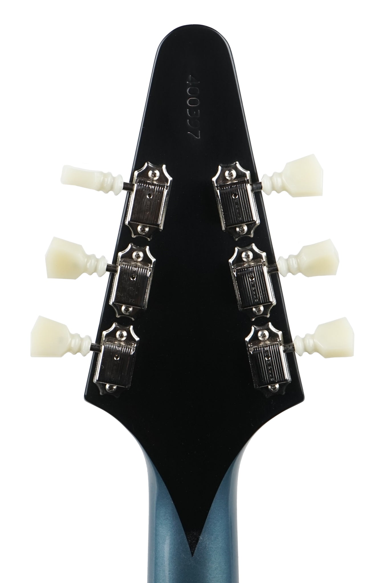 In careful planning with the Gibson Custom Shop we are pleased to offer our newest member of the Made 2 Measure Thunder Road Stinger Series: Custom Shop 1967 Mahogany Flying V in Bahama Blue. This fabulous instrument features a VOS finish, medium neck profile that measures .90 @ 1st and 1.00 @ 12th, dual un-potted Custombuckers, bound fingerboard w/ white binding and a black headstock stinger. This model is one of a very limited batch. Pro setup in house and comes complete with its original hard case.