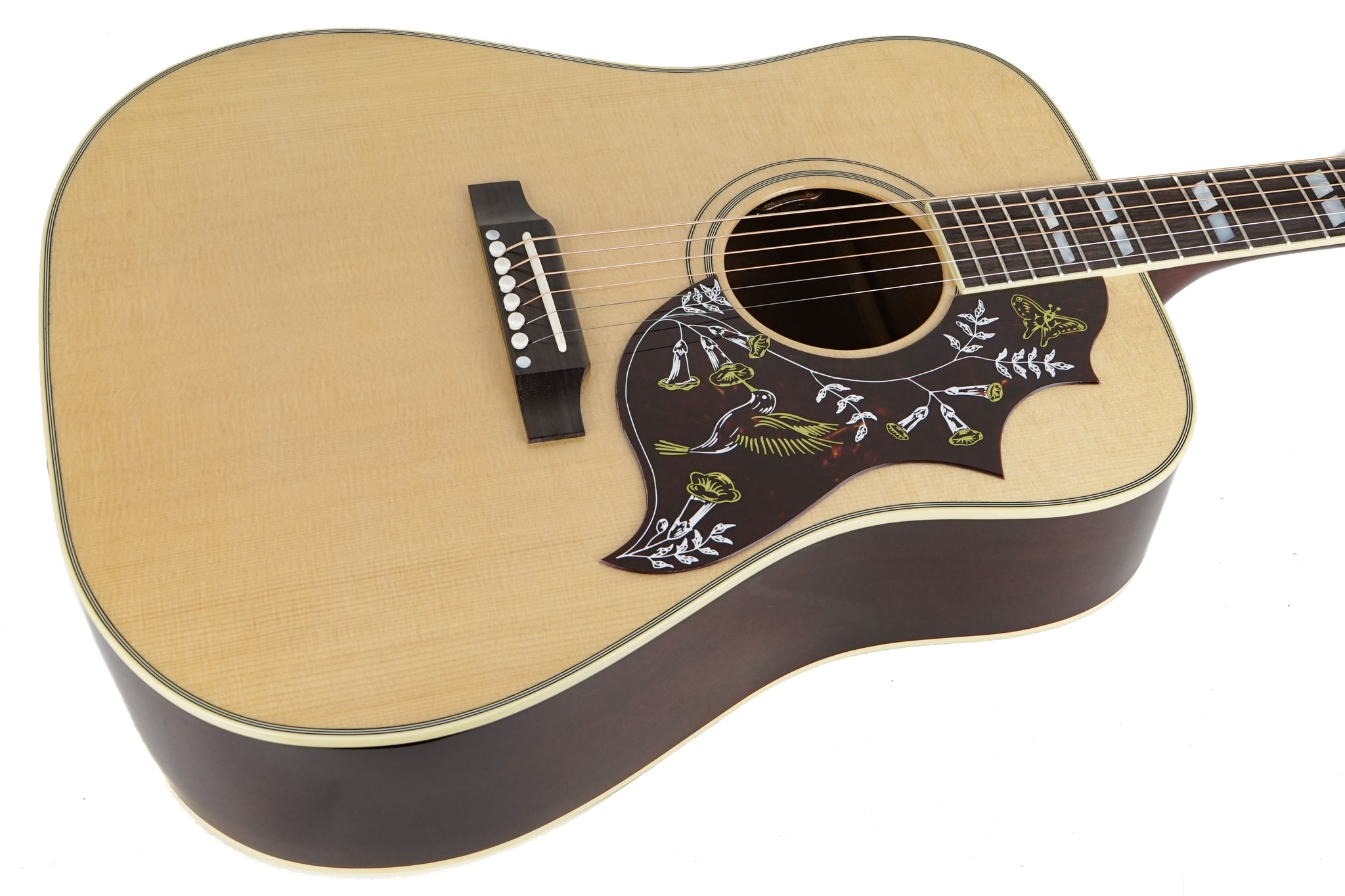 The unmistakable Gibson Hummingbird is followed by the masses as one of the most remarkable acoustic guitars ever built. The new Hummingbird Original blends vintage appointments and today's modern, high-quality build construction. Outfitted with gold Gotoh Keystone tuners, double antiqued binding, a traditional Hummingbird truss rod cover, and a bone nut and saddle, it's available in Antique Natural or Heritage Cherry Sunburst finish