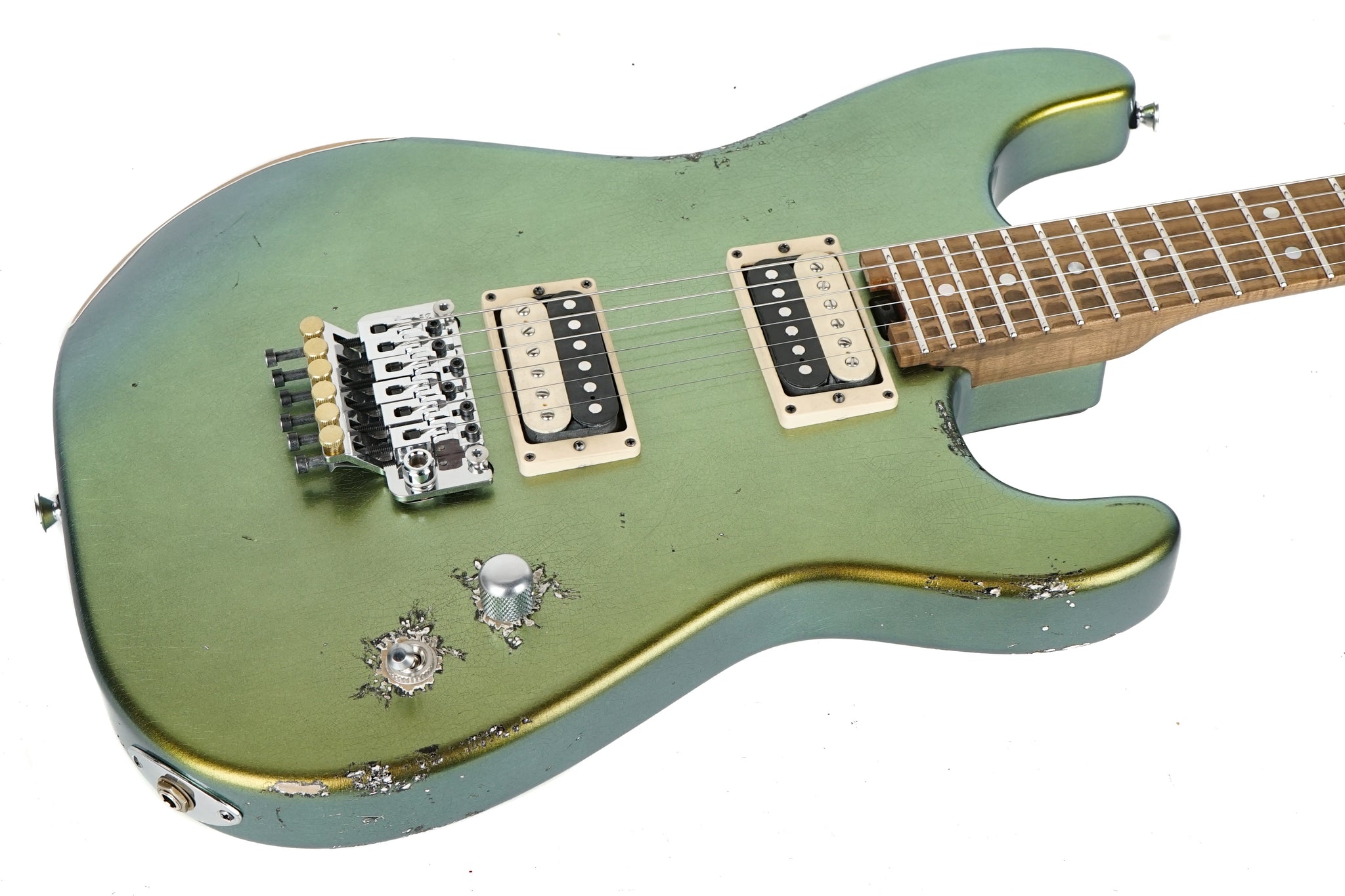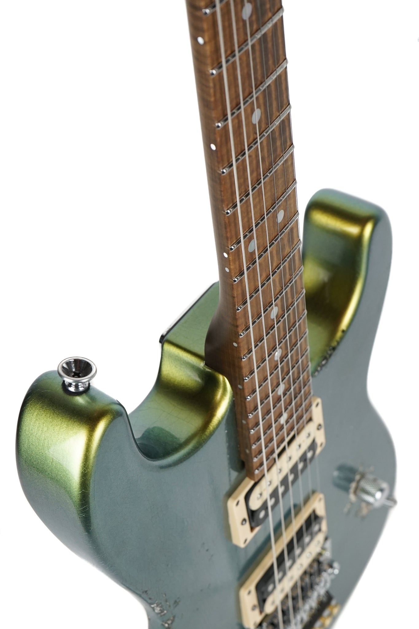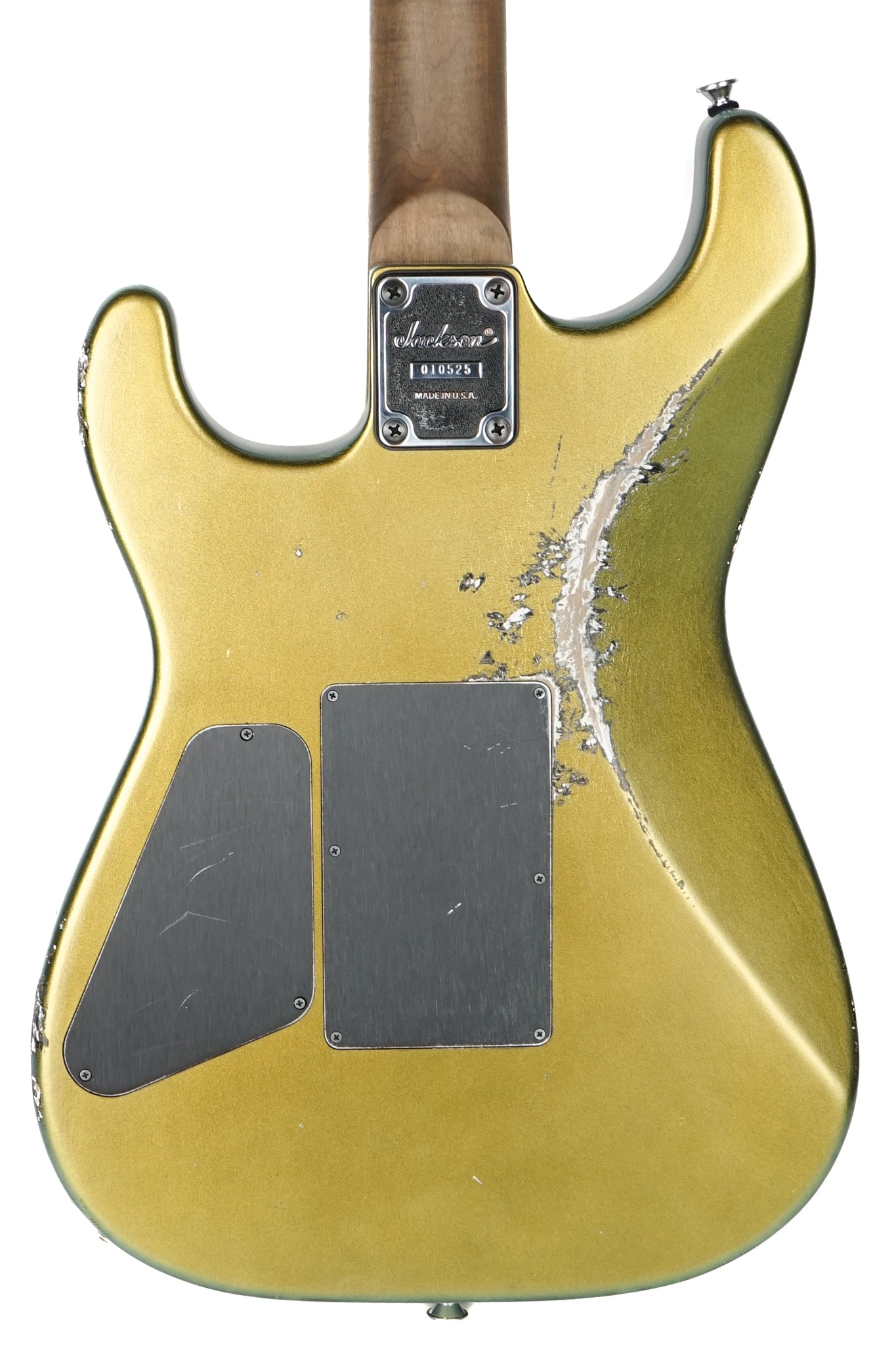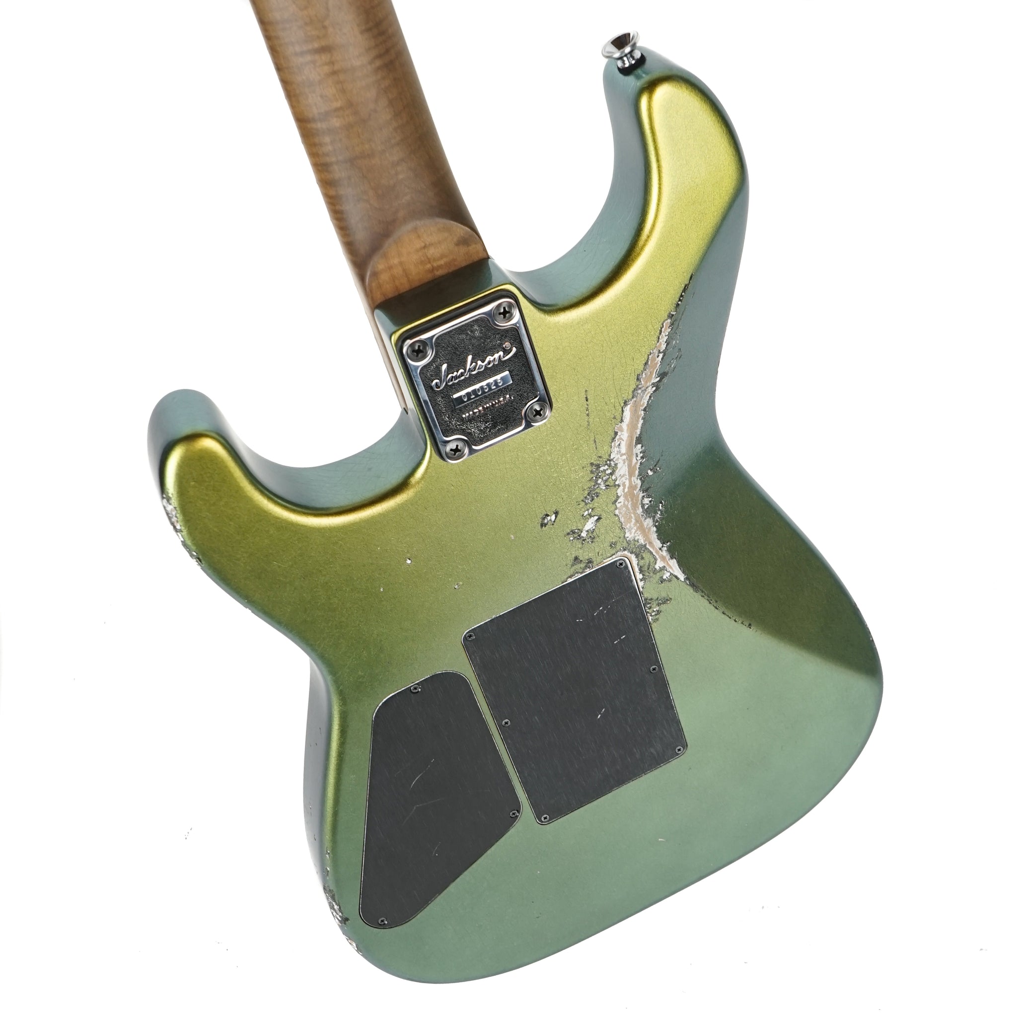 In careful planning with the Jackson Custom Shop we are pleased to present the Jackson Custom Shop Thunder Mod San Dimas Nitro Relic in Acapulco Gold. These guitars are a true labor of love and we are absolutely thrilled with how they turned out. The iridescent finish runs the gamut from gold, to green, to blue, and back again - all depending on your viewing angle (we've included a couple of shots for your perusal).