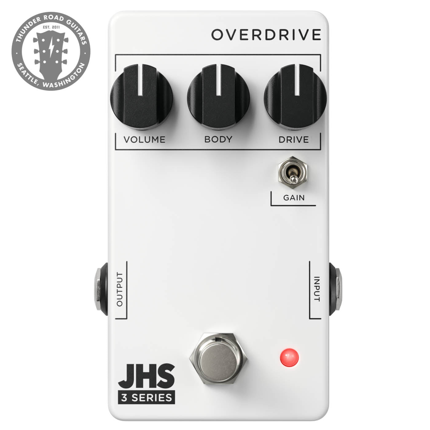 The JHS Pedals 3 Series Overdrive offers a wide range of overdrive sounds within straightforward design aesthetics. You can achieve anything from boost, transparent low gain, to huge amp-like medium overdrive sounds. The simple knob functions give you control over the Volume, Body (or EQ), and Drive. The Gain toggle gives you a choice between more saturated and compressed or more open and crunchy dynamics. This switch plays a big part in how the pedal responds to your playing and touch as a player. The JHS Pedals 3 Series Overdrive runs on 9V DC Negative Center power and consumes 12mA.