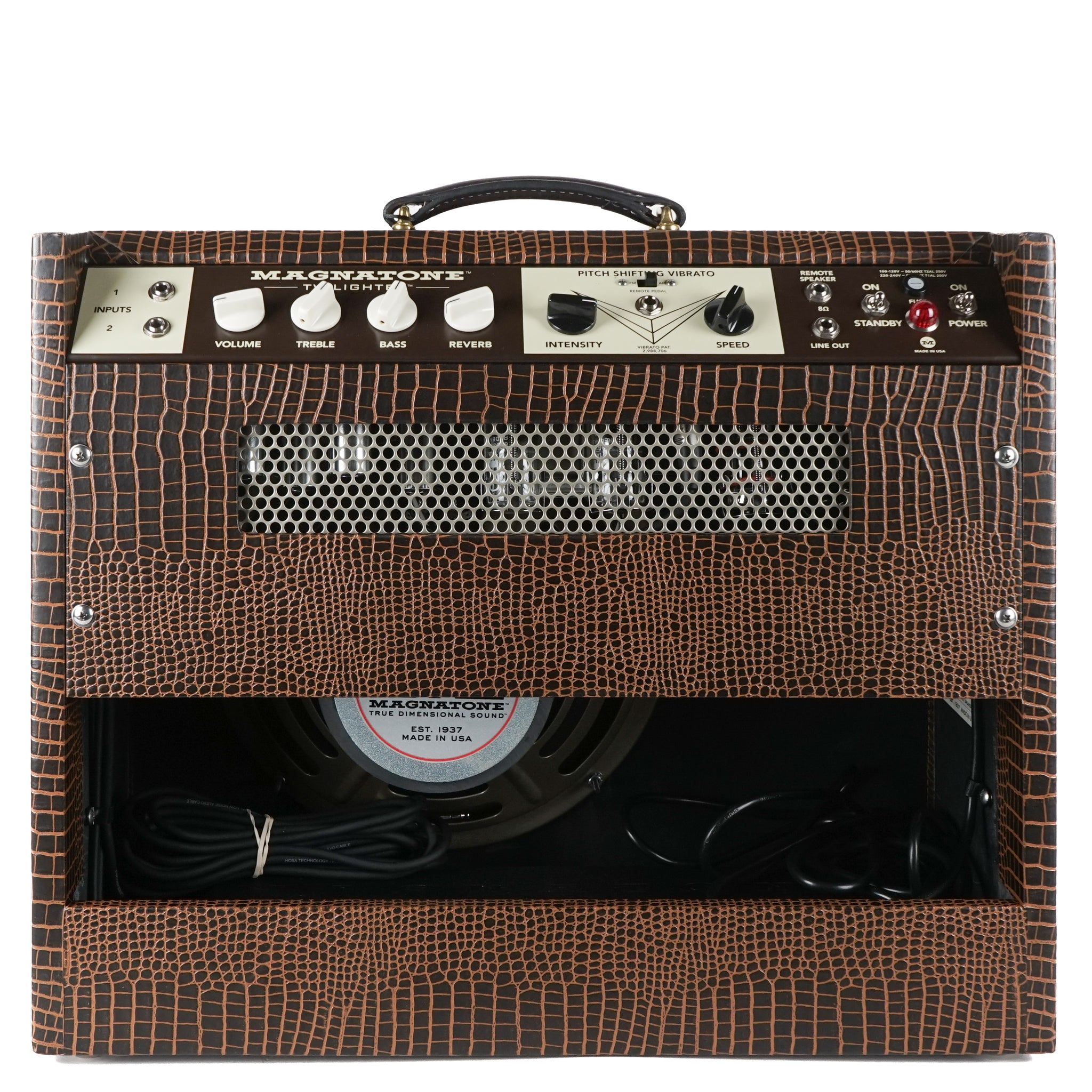Up for sale is a New Magnatone Twilighter Combo Amp. This amp is killer and comes in a Thunder Road Exclusive Colorway of Brown French Alligator Tolex and a Gold Stripe Grill. This amp looks absolutely stunning in person and sounds even better. Thunder Road Guitars is Washingtons only Magnatone dealer and we could not be more proud. Come by and give this one a spin!