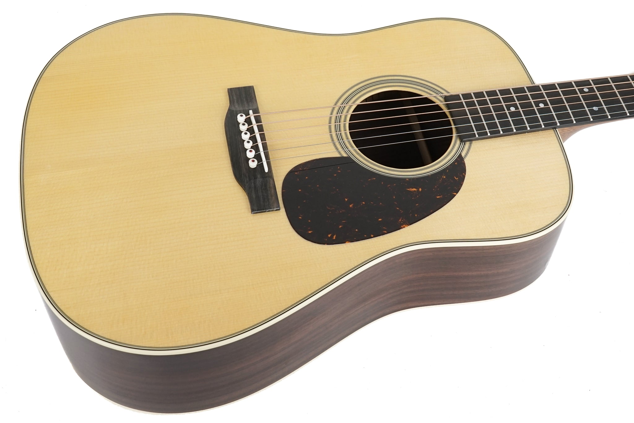 The Martin D-28 is widely regarded as the most iconic acoustic guitar in the world, trusted by generations of players and played by countless legends across genres. Its Dreadnought body size and scalloped bracing delivers the bold, projective tone with strong bass, clear trebles, and rich overtones that has defined acoustic music for nearly a century. Handcrafted with a solid spruce top and solid East Indian rosewood back and sides, the D-28 produces a resonant voice that’s beautifully balanced for all playing styles. The satin neck, featuring a Golden Era (GE) Modified Low Oval profile, high-performance taper, and 25.4" scale length, ensures smooth, effortless playability. With antique white binding, an ebony fingerboard with mother of pearl dot inlays, an ebony bridge with bone pins, and nickel open gear tuners, the D-28 blends timeless craftsmanship with modern playability. Available in a variety of gloss and satin options, the D-28 is the guitar you can trust to unleash the artist within.