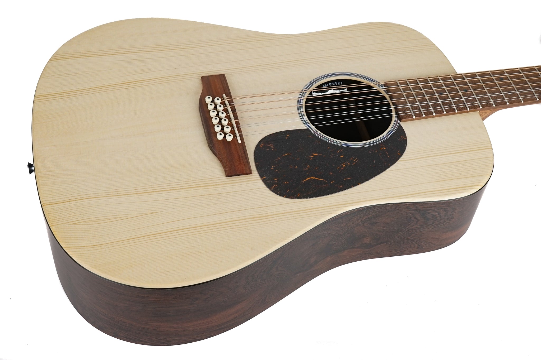 The X Series is made to play. The acoustic-electric D-X2E Brazilian 12-String features a hand-rubbed satin spruce top with an elegant abalone pattern rosette and eye-catching Brazilian rosewood pattern high-pressure laminate (HPL) back and sides for added durability and looks, without sacrificing that classic Martin tone. Playability enhancements include a thinner fingerboard with a gently beveled comfort edge and refined string spacing, and a modernized bridge contour for a smooth and comfortable playing experience. It also features a select hardwood neck, fingerboard, and bridge for improved sound and sustain, and Martin E-1 electronics with a built-in chromatic tuner and volume, tone, and phase controls. The D-X2E Brazilian 12-String's iconic Dreadnought body size is loud and projective with strong bass, lending itself to any genre and experience level, while the extra strings provide a unique layer of chime, tone, and texture. All X Series models come with a softshell case.