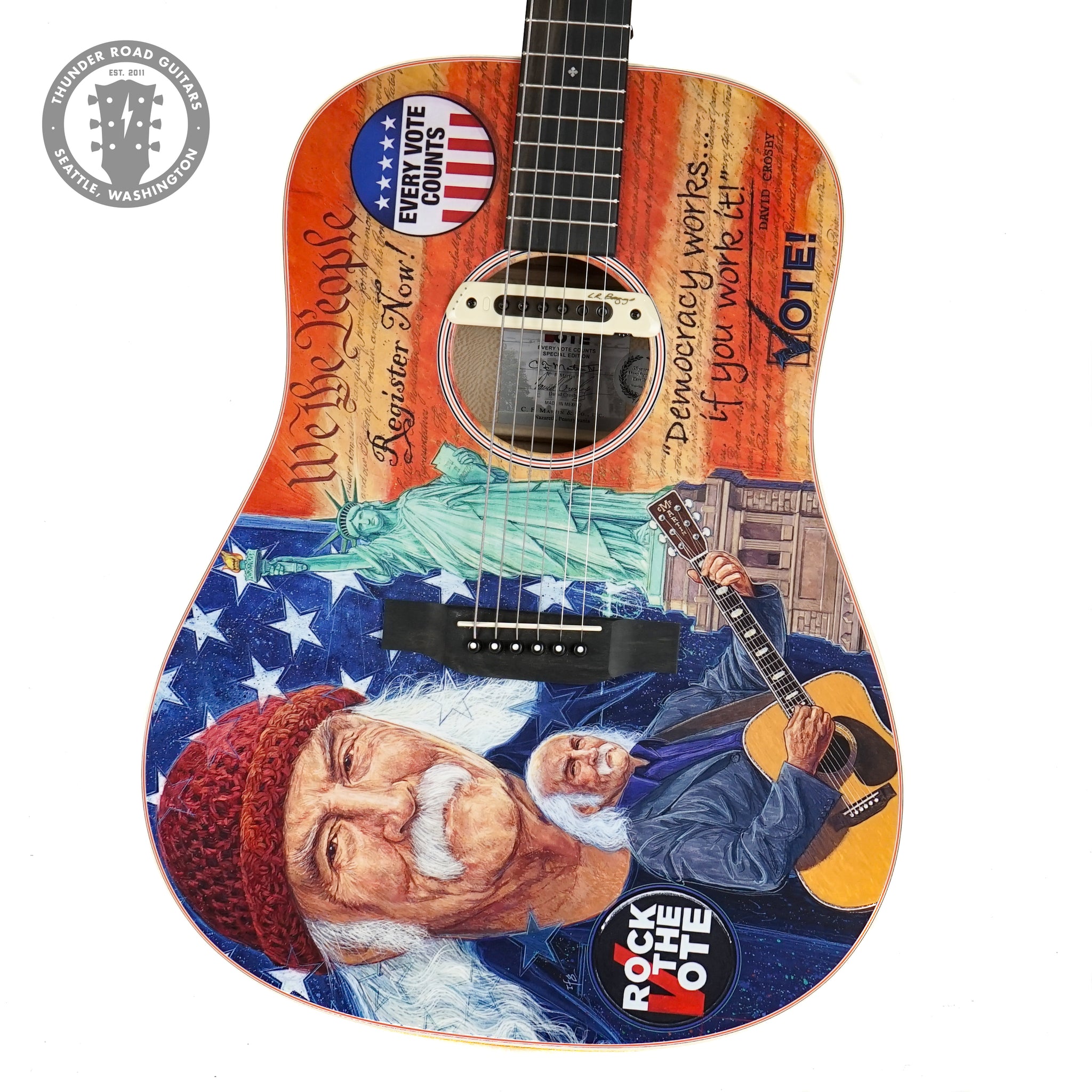 The Martin D-11E Rock the Vote acoustic-electric guitar is a special edition instrument crafted to inspire young people to get involved in our democracy. This collaboration between Martin Guitar, David Crosby’s estate, Rock the Vote, and artist Robert Goetzl tells a powerful story. “David was a patriot,” says Chris Martin IV. “He believed deeply in this great experiment of ours, and his passion for voting is something we wanted to honor and continue.” A reissue of the original D-16E Rock the Vote guitar launched in 2020, the all-new D-11E Rock the Vote model includes new features like an LR Baggs M80 soundhole pickup paired exclusively with Luxe by Martin® Kovar™ strings. Kovar is a unique alloy of two ferromagnetic metals, nickel and cobalt, not found in conventional phosphor bronze strings. When paired with the adjustable M80 humbucking coil, these strings are guaranteed to deliver an exceptional acoustic-electric experience. It’s the ideal pairing for players seeking warm, authentic amplified tones in any performance setting. The guitar features American sycamore satin back and sides and a spruce gloss top showcasing Robert’s custom artwork, and its Dreadnought size and 000 depth offers a powerful, projective sound with a comfortable feel. This limited edition of 47 guitars honors the election of the 47th U.S. president. Not only does it commemorate David Crosby’s legacy, but through this collaboration, Martin Guitar is proud to support Rock the Vote – a non-partisan non-profit organization dedicated to building the political power of young people – with a $5,000 donation. “I believe it’s our responsibility as citizens to participate in our democracy,” says Chris. “It's important that you register, it's important that you vote."