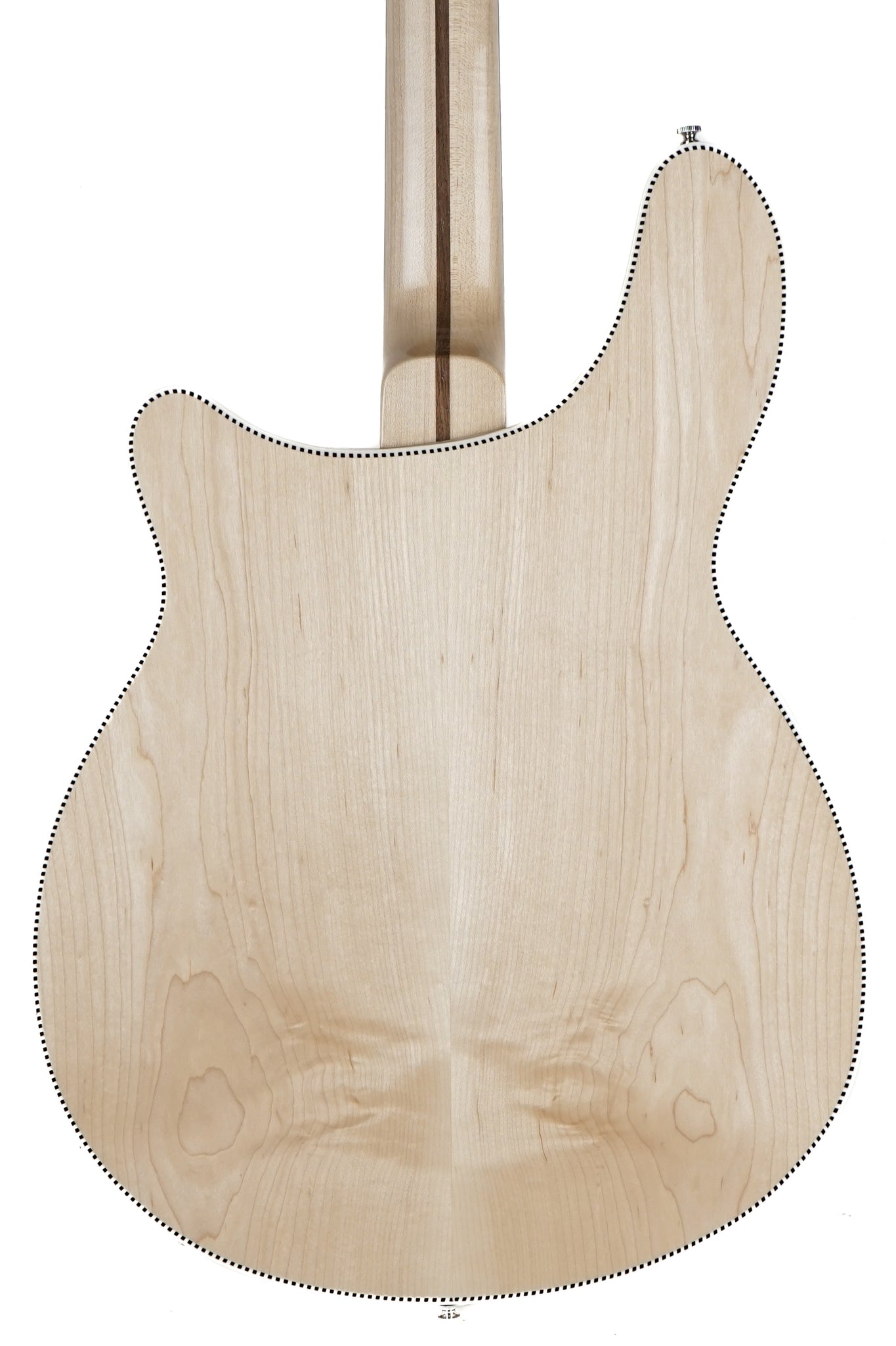 The body shape followed the styling of the "New Style" Rickenbacker 360 model. This semi-hollow bass guitar had a rounded top edge, double cutaways and equipped with two pickups. The neck has a fingerboard with 21 frets and was attached to the body rather than "neck-thru" as on the solid body basses. It has a crescent soundhole, an 'R' tailpiece, checkerboard binding and pearlescent inlays.