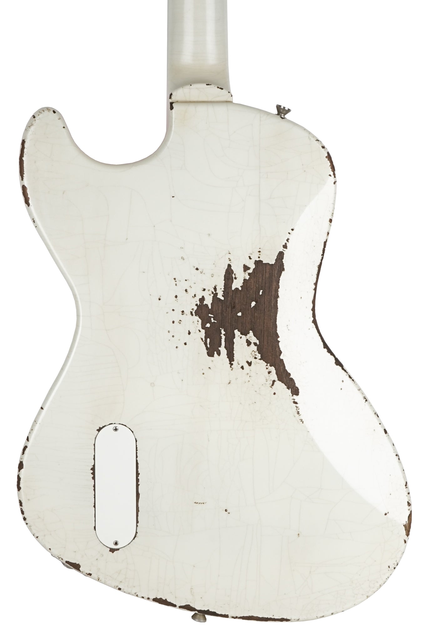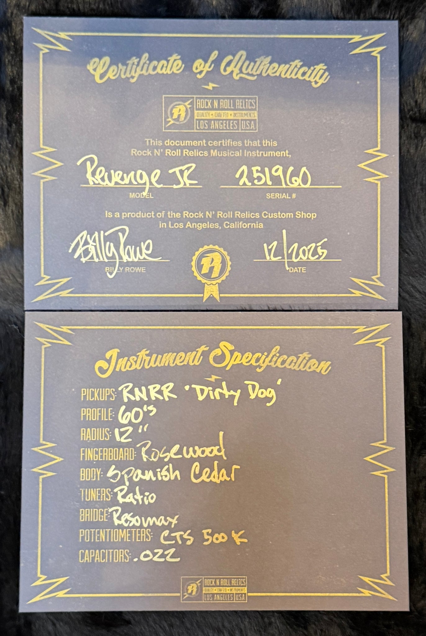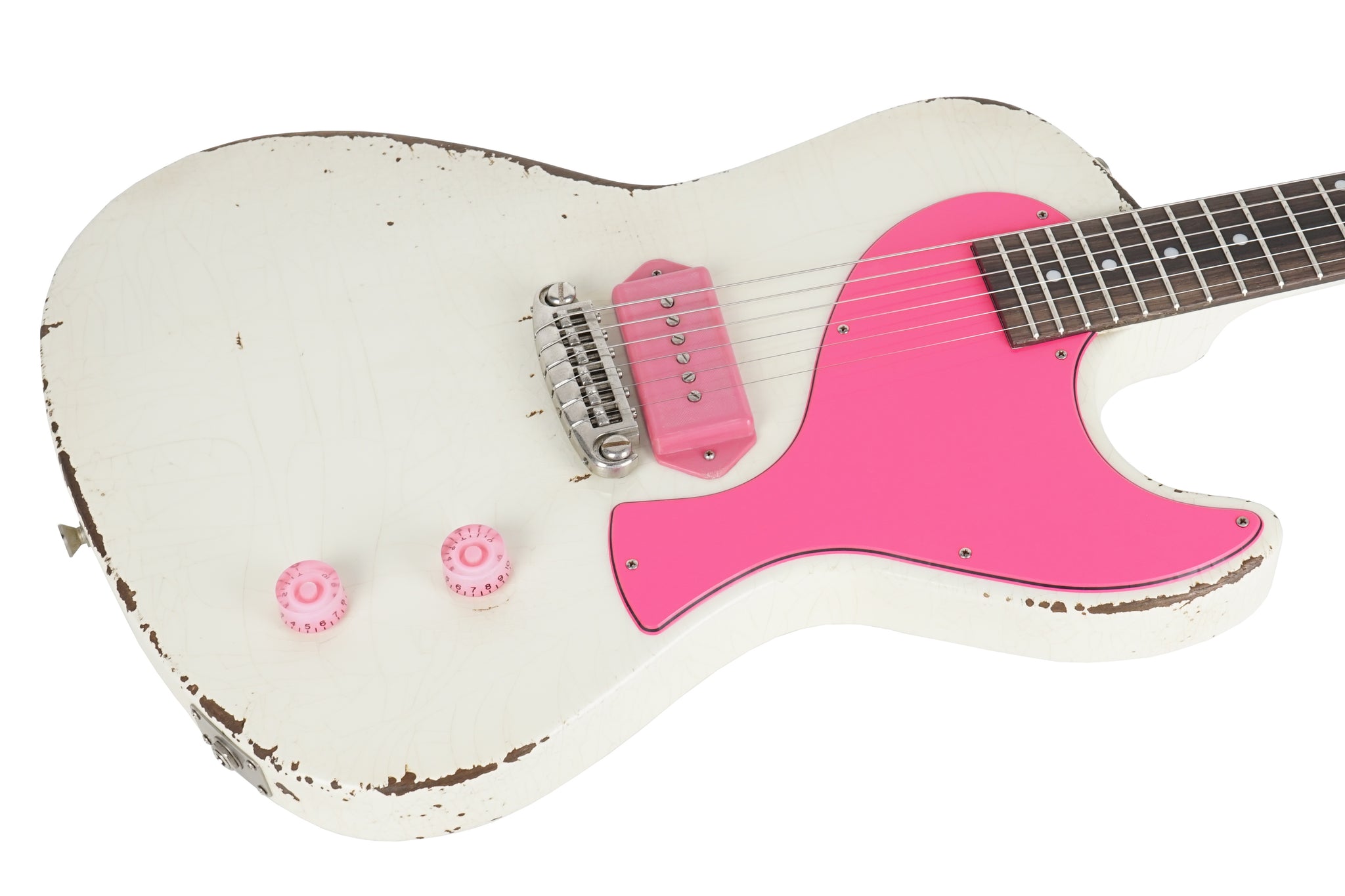 Up for sale in the shop is a brand new Rock N Roll Relics Revenge Jr. in White with Pink Appointments. Holy moly this guitar is a total jaw dropper! This one features a RNRR Dirty Dog in the bridge, 60's neck profile, 12" radius rosewood fret board, Spanish cedar body, ratio tuners, and a Resomax bridge.