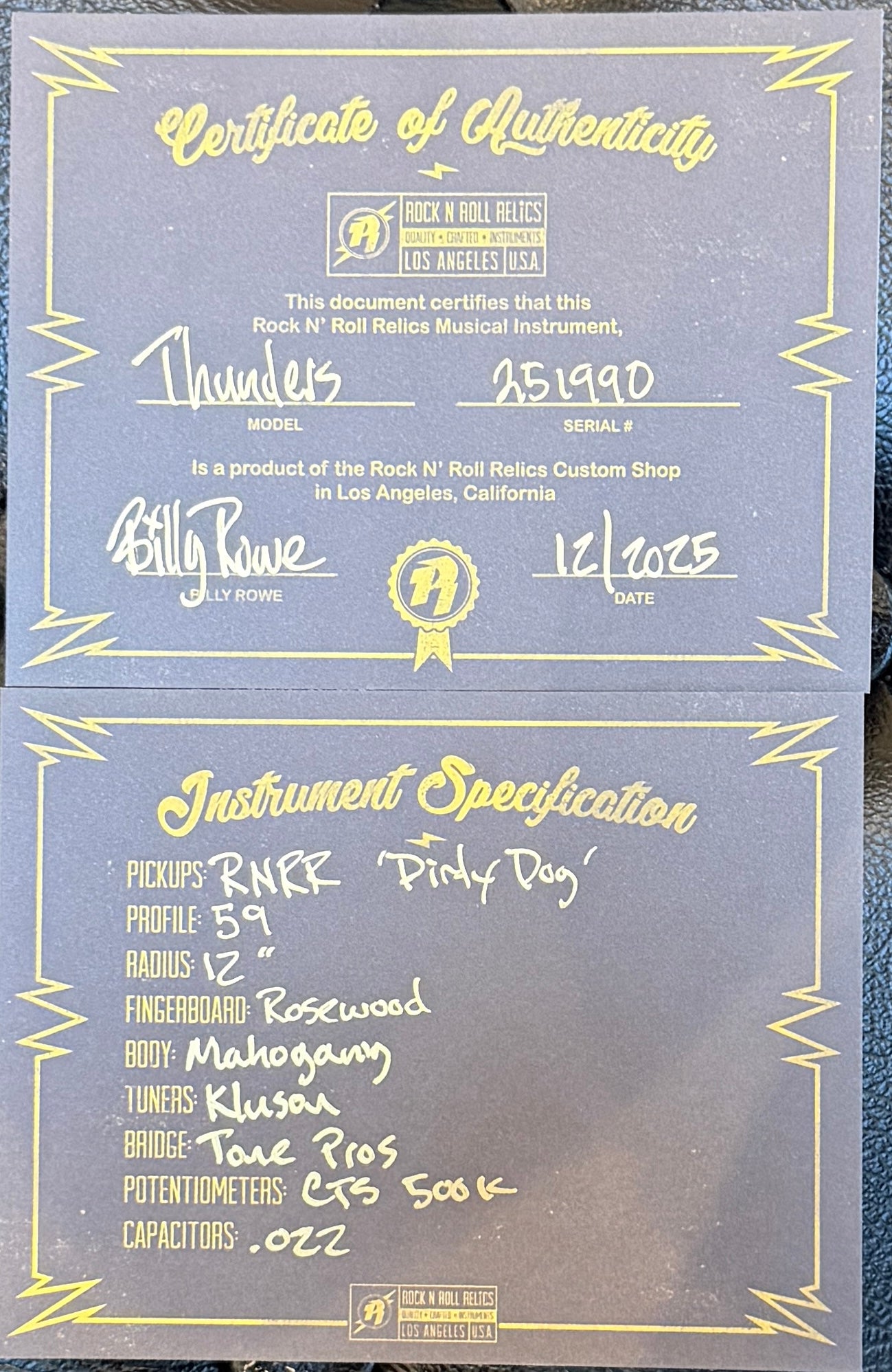 Up for sale in the shop is a brand new Rock N Roll Relics Thunders Double Cut in Dog Hair finish . Holy moly this guitar is a total jaw dropper! This one features a RNRR Dirty Dog in the bridge, '59 neck profile, 12" radius rosewood fret board, Mahogany body, Kluson tuners, and a Tone Pros bridge.
