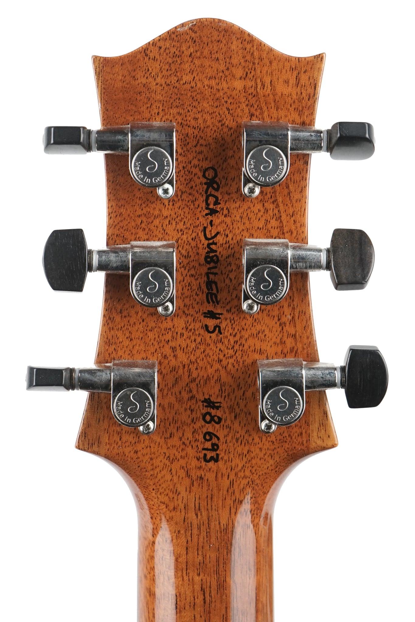 Up for sale in the shop is a stunning and previously loved Nik Huber Orca Limited edition Jubilee in Faded Amberburst. This beautiful instrument is #5 out of 20 made. It features a gorgeous flame maple top, Brazilian Rosewood board, and Haussel pickups with coil tap. Cosmetically this one is pretty clean less a bit of pitting on the pickup covers and some light scattered play wear. This fantastic guitar comes with its original hardshell case and a fully pro setup from our in house tech. Weight: 8lbs. 6oz.