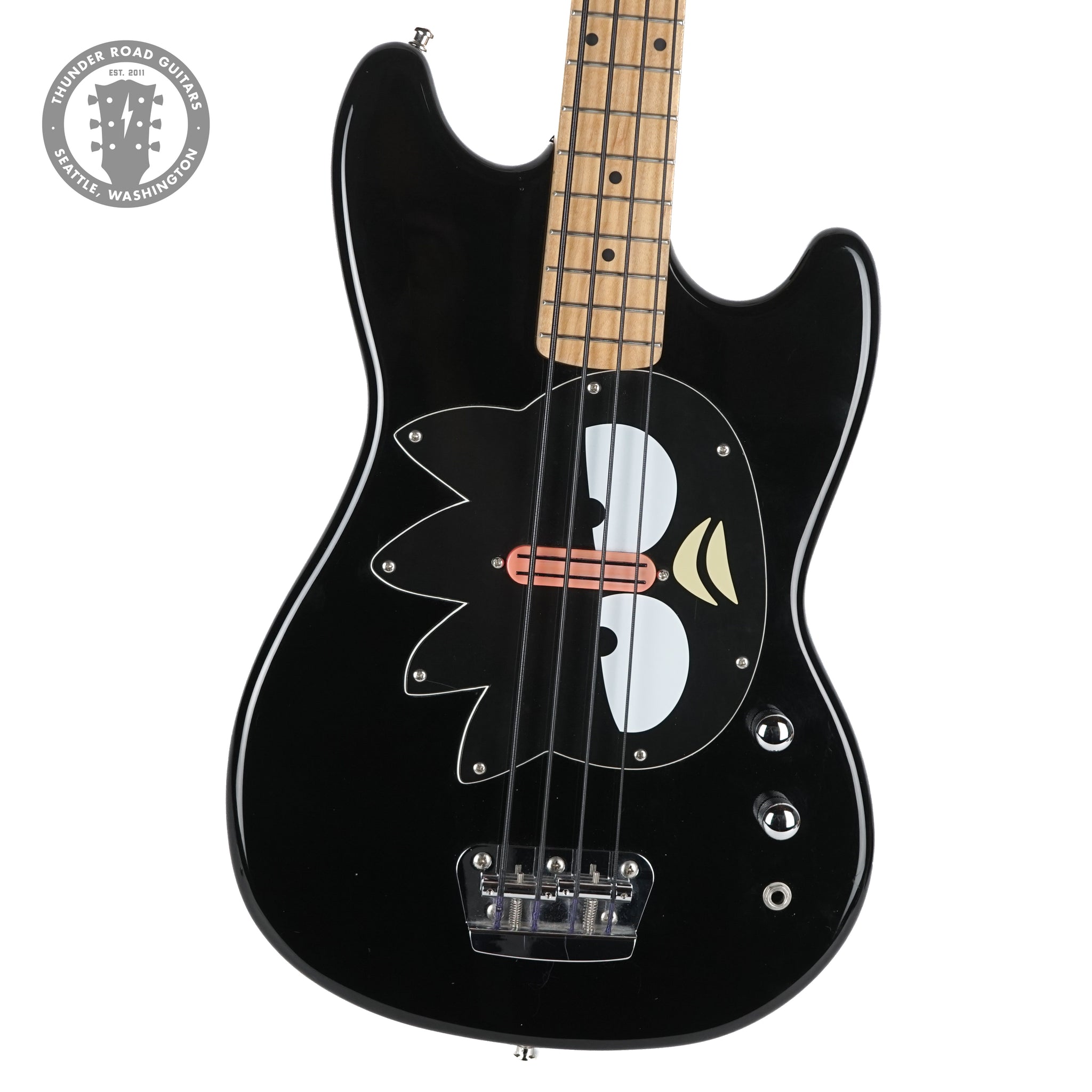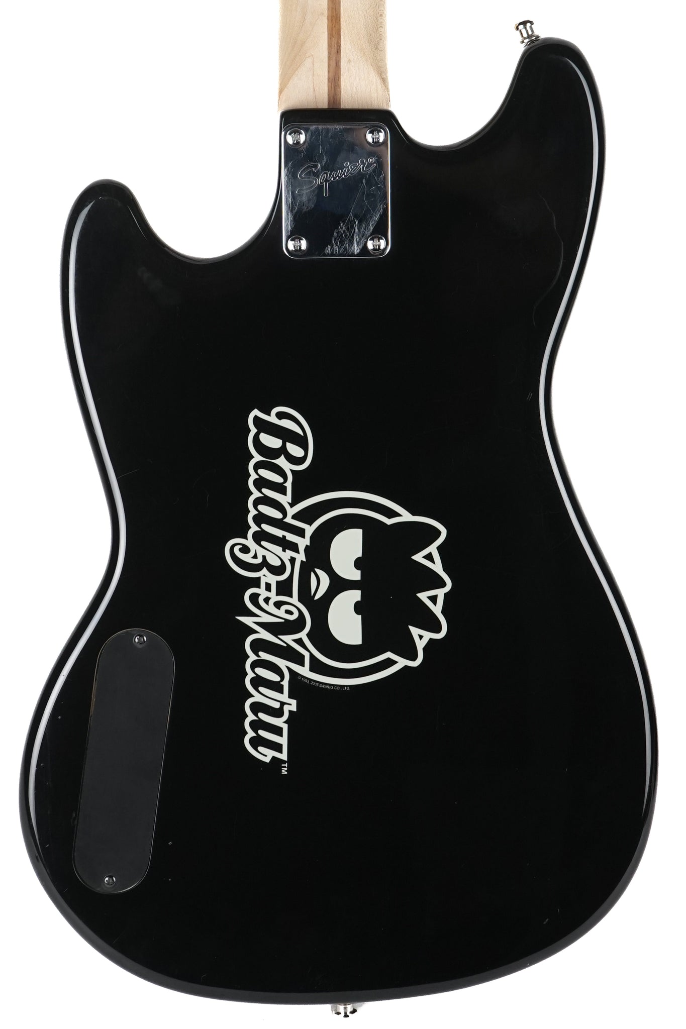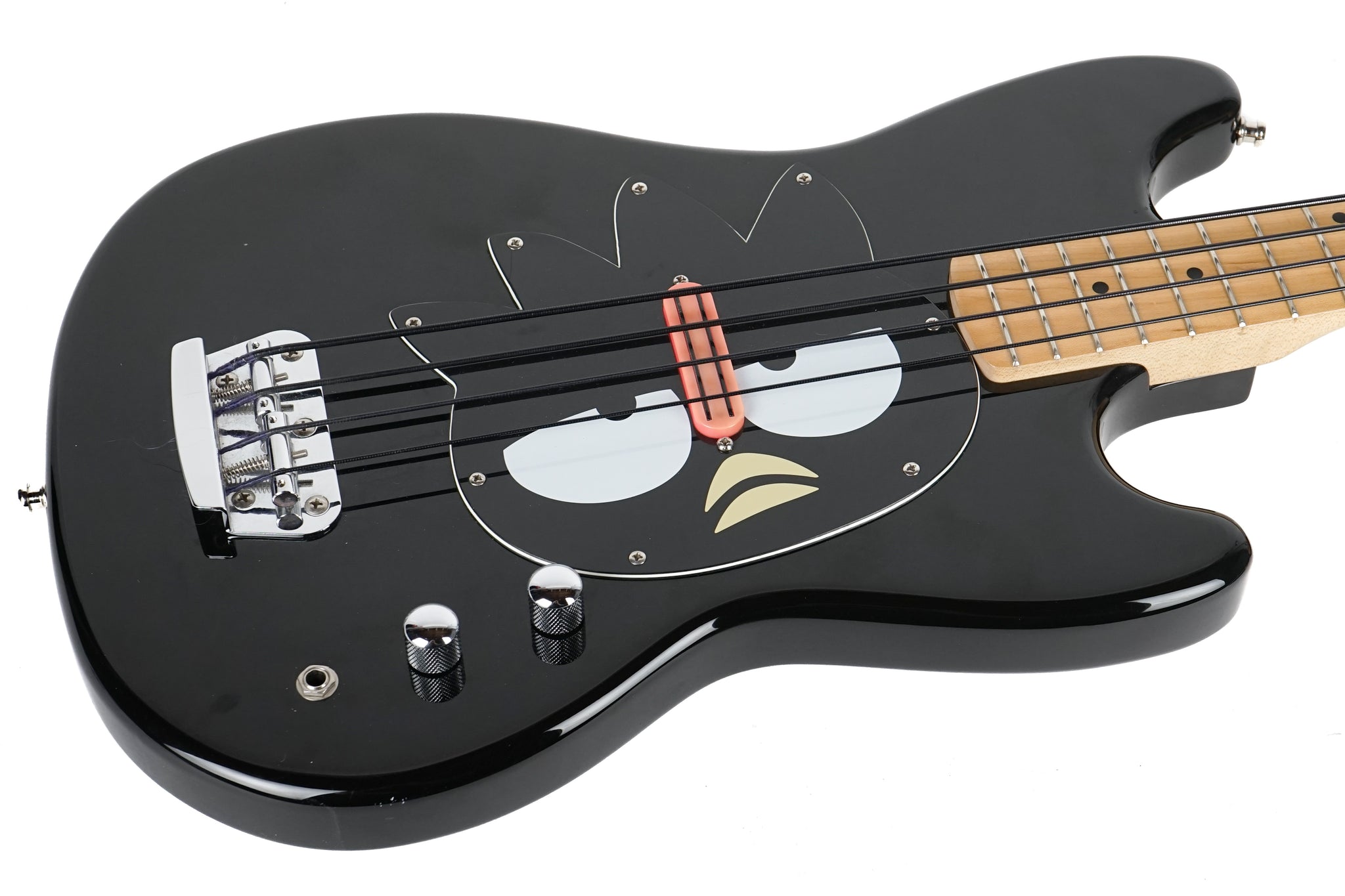The "Badtz-Maru Fender bass" a limited edition  Hello Kitty themed Squier Bronco style bass featuring a black body and a unique Badtz-Maru character pickguard with the character's image printed on it. It is a short-scale (30-inch) bass guitar known for being easy to play and a collectible item for fans of Sanrio characters.  The pickup in this instrument has been replaced.