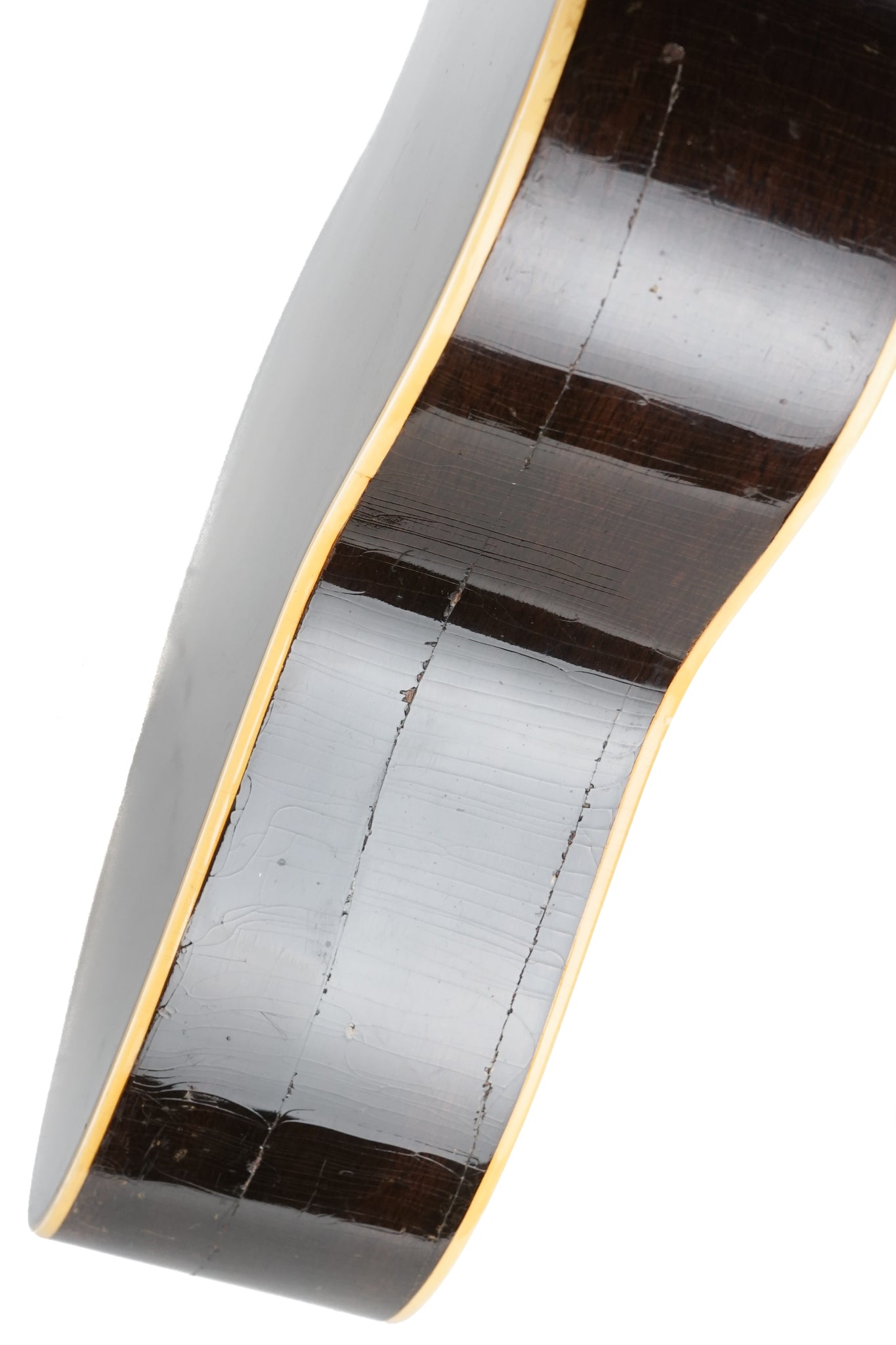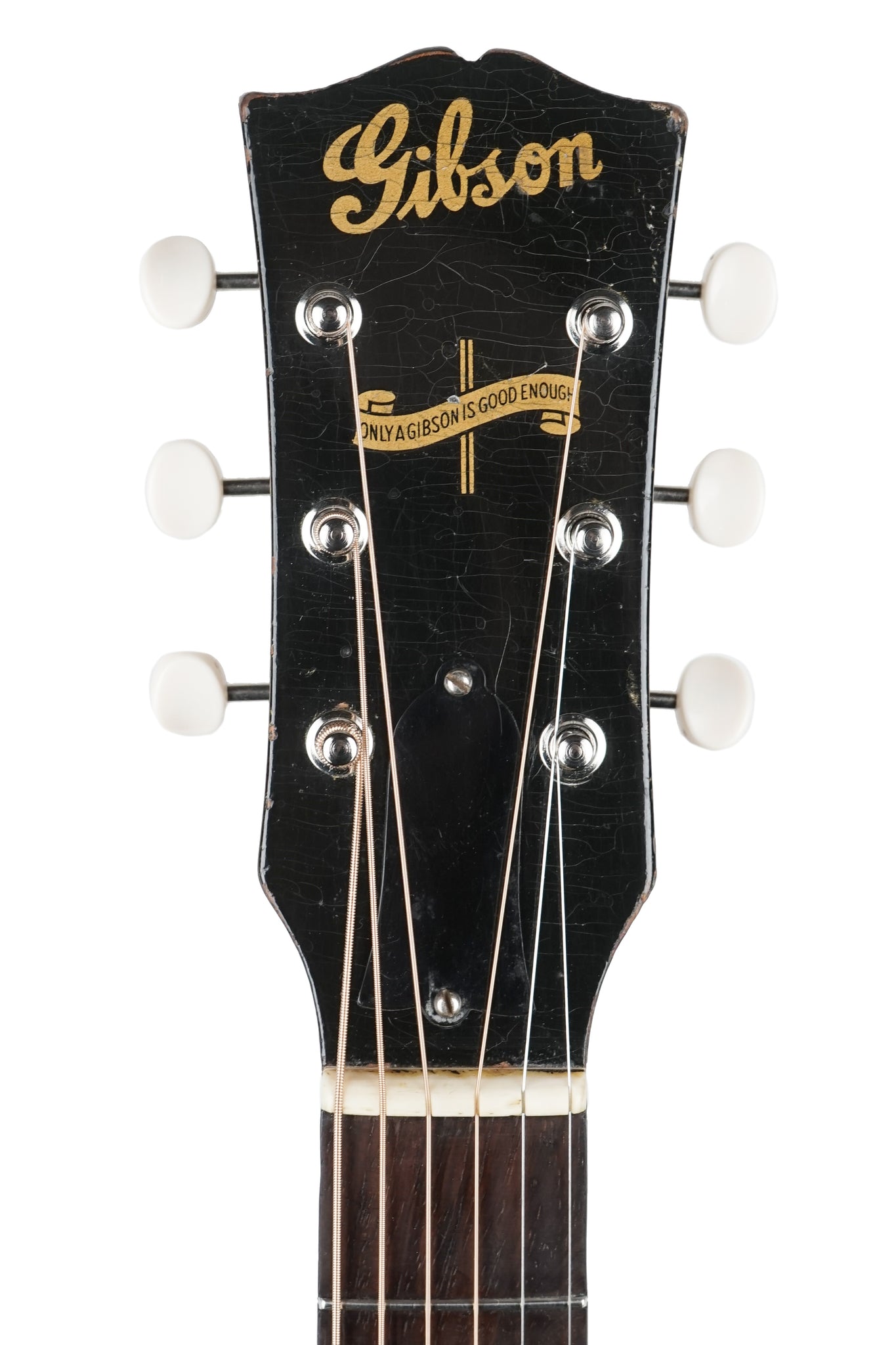 Up for sale is a 1945 Gibson LG-2 "Banner" in its original sunburst finish. This LG-2 features a spruce top w/ mahogany back and sides, fairly chunky neck profile, small pickguard and lots of wear and tear. There are a few long cracks on the bass side of the body which have been repaired and cleated. The guitar has had a neck reset and refret performed in its life and the tuners are a modern repro set. This example sounds absolutely wonderful and plays great up until around the 15th fret where the low E and A choke out. All in all an absolutely wonderful Banner era LG-2. Pro setup in house and comes complete with a modern non original hard case.