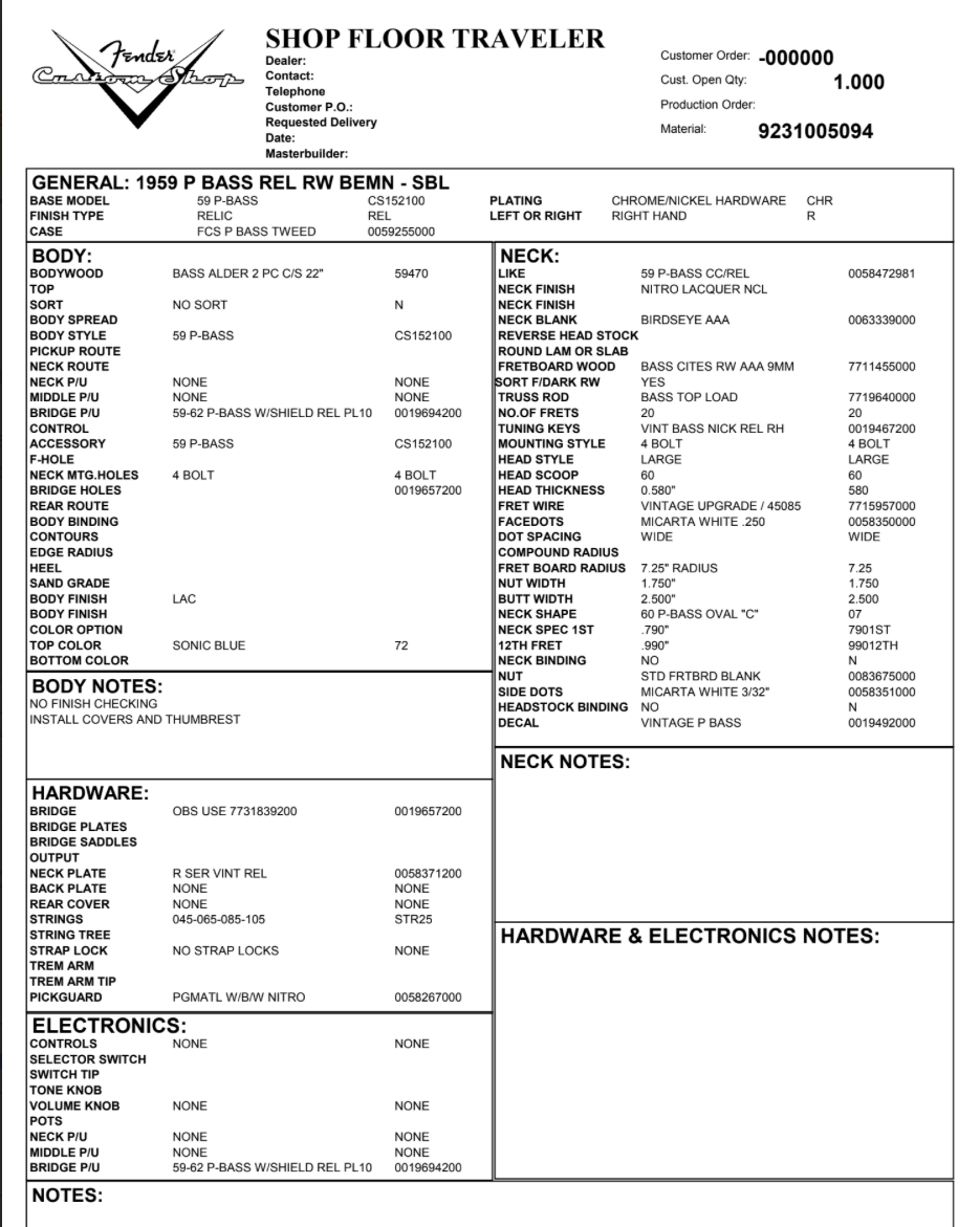 Up for sale is a 2013 Fender Custom Shop 1959 Precision Bass Relic in Sonic Blue. This example is in excellent factory relic'd condition showing no wear aside from what was done at the custom shop.  We are an authorized Fender Custom Shop Showcase Dealer and have one of the largest selections of Fender Custom Shop instruments in the Pacific Northwest. For a full list of specs please see the build sheet photo in our ad. Pro setup in house and comes complete with its original hard case and paperwork, sans the COA. We can order a replacement COA from Fender to the buyer of this instrument at no charge. Weight: 8lbs. 6oz.