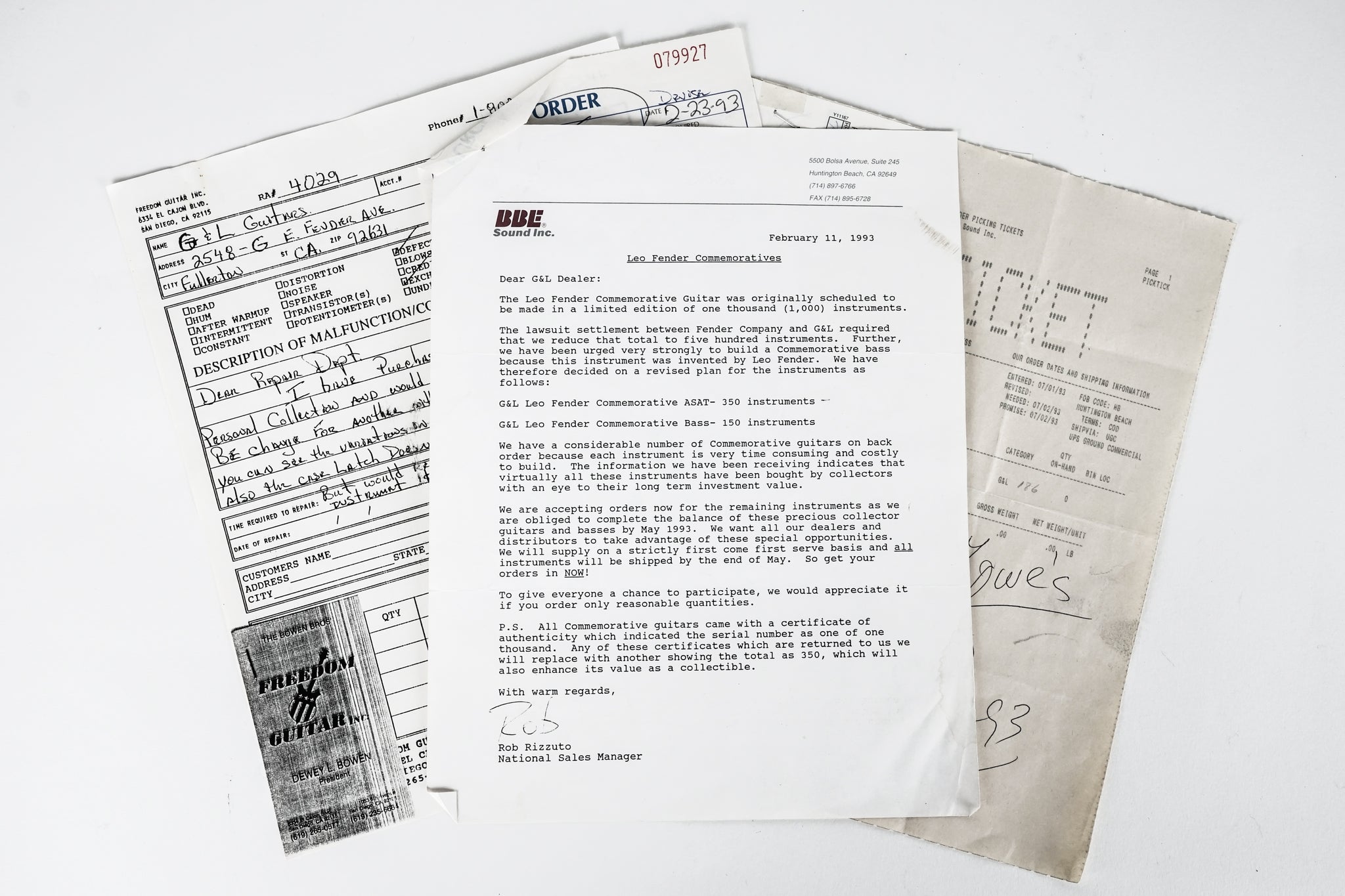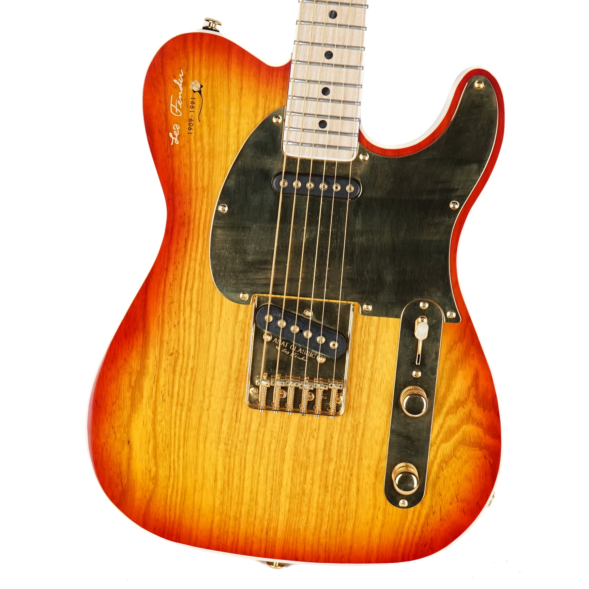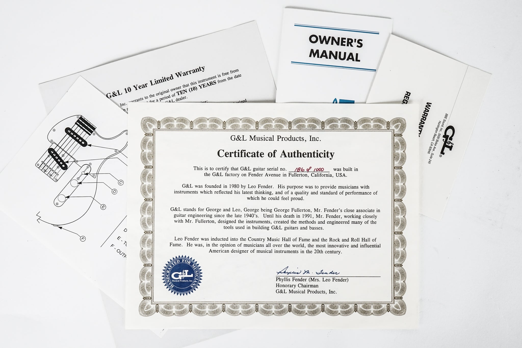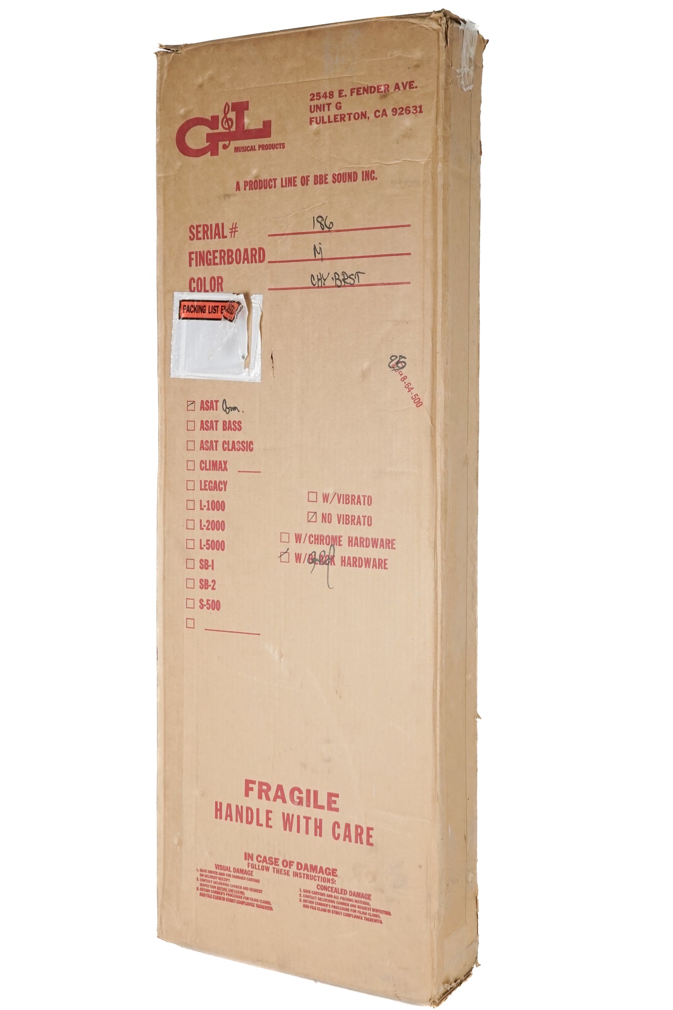 Up for sale is a 1991 NOS (New Old Stock) G&L Leo Fender Commemorative ASAT Classic in Cherry Sunburst complete with all original paperwork, original gold strings and original shipping box. This guitar was ordered by G&L dealer Freedom Guitars in 1991 and was kept in their personal collection and never put out for sale. Every shred of paperwork is included and shy of some natural pitting on the gold pickguard this guitar is in un-used / time capsule condition. Being the strings are original we have not changed them nor set the guitar up. It will come as shown in our photos. Weight: 7lbs. 13oz.