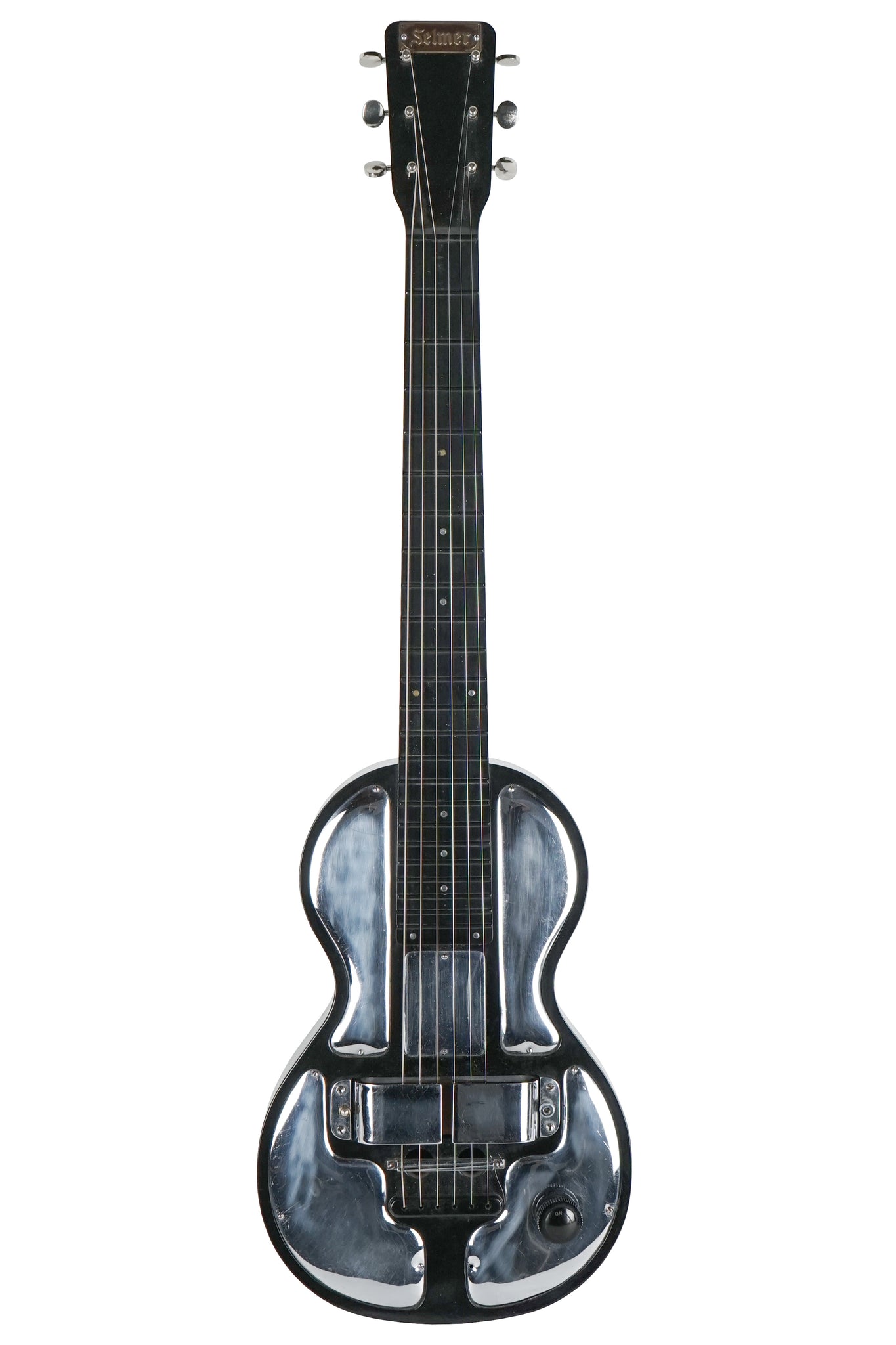 Up for sale is a very cool and quite rare 1930's Selmer branded / Rickenbacher Electro Spanish Round Neck Lap Steel Guitar in Chrome w/ Bake-lite.